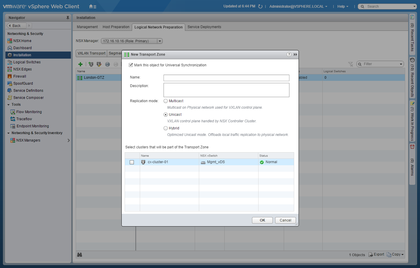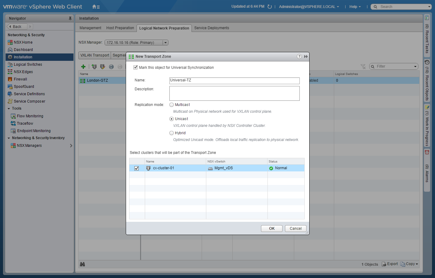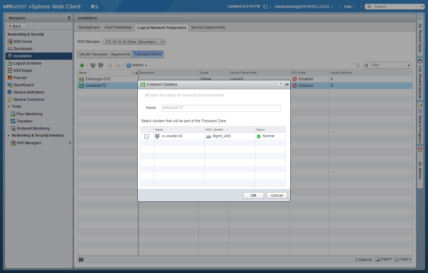 In this example, we’re going to add a cluster from the Secondary NSX Manager to the existing Universal Transport Zone.