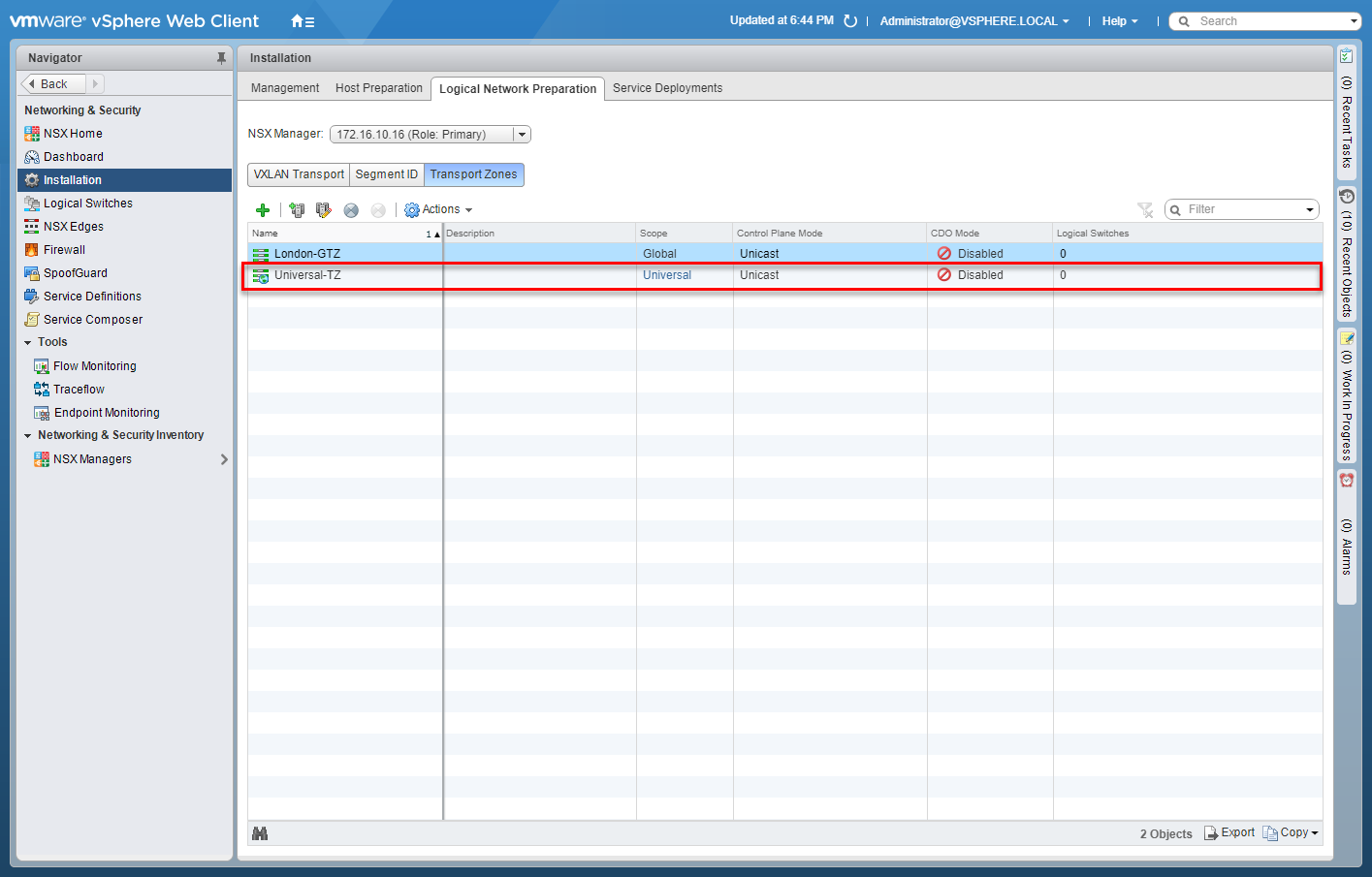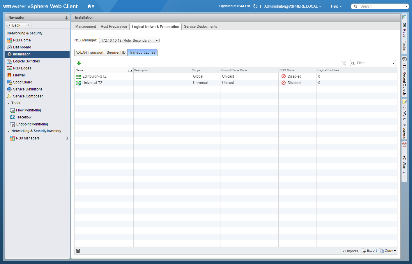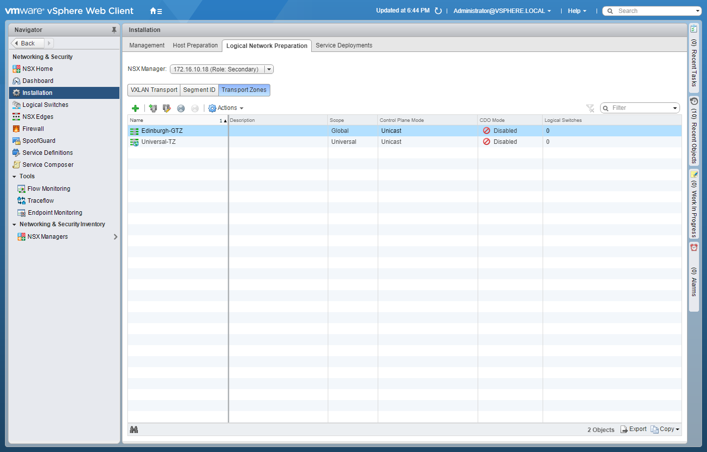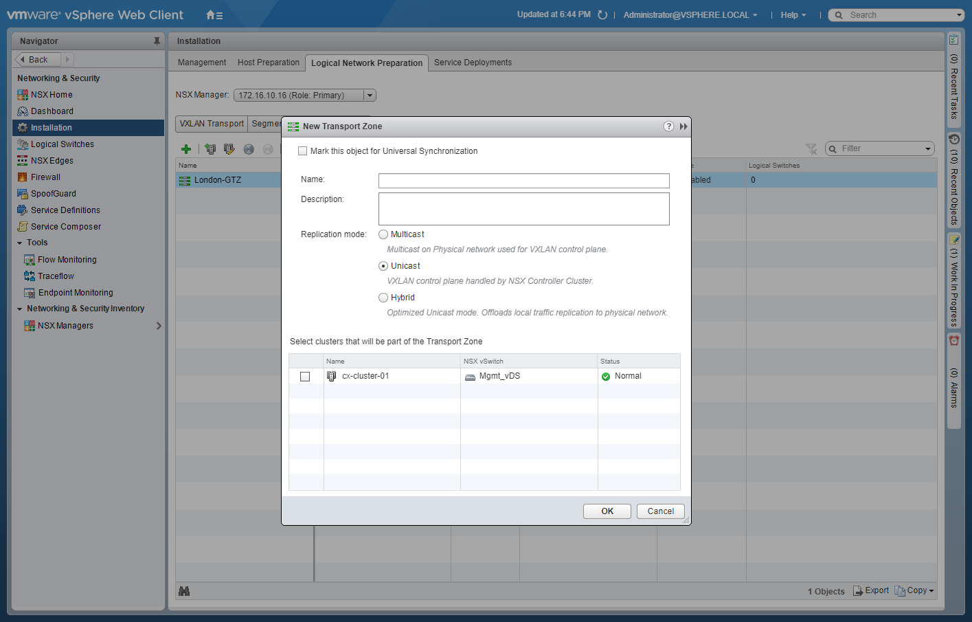 In this example, we’re going to add a cluster from the Secondary NSX Manager to the existing Universal Transport Zone.