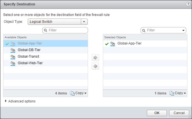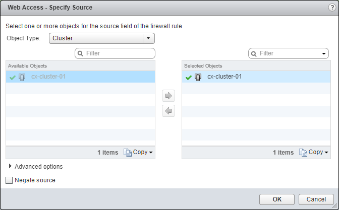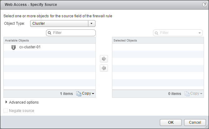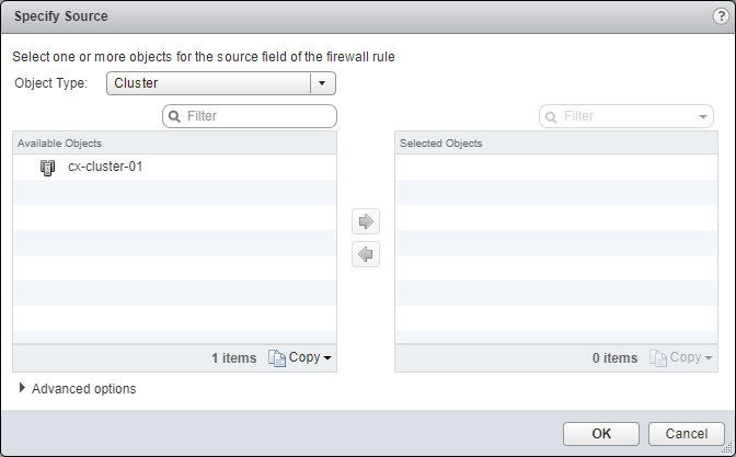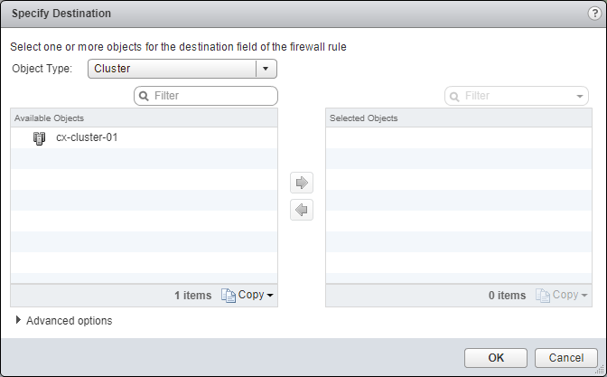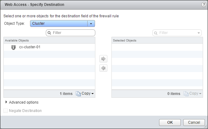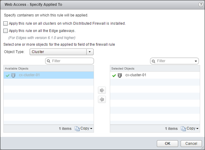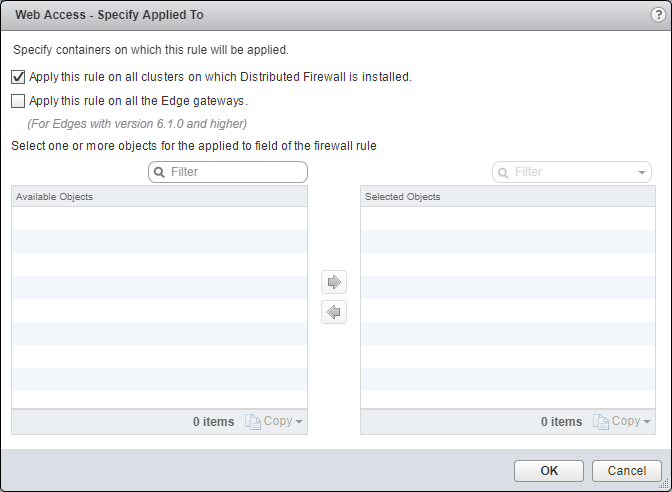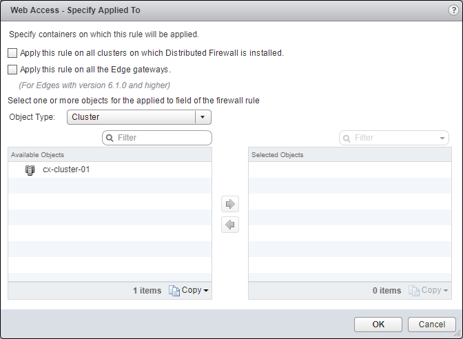 - Uncheck the Apply this rule to all clusters on which Distributed Firewall is installed checkbox.