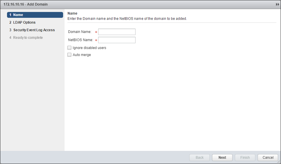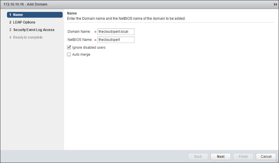 - Enter the Domain Name, NetBIOS Name and (optionally) check Ignore disabled users and Auto merge checkboxes.