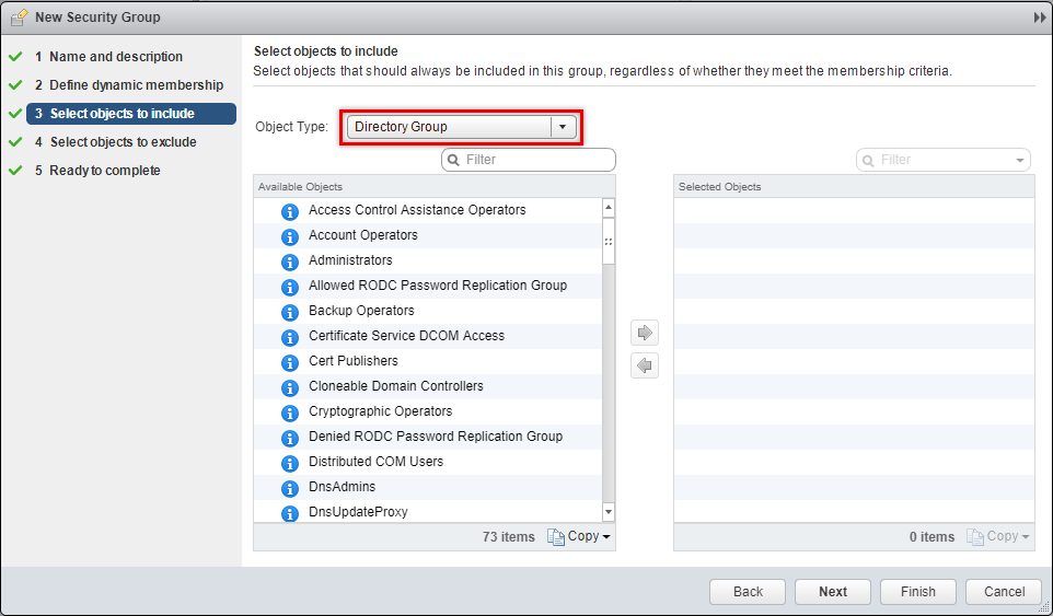 When you now create NSX Security Groups there will be another object type available called Directory Group.