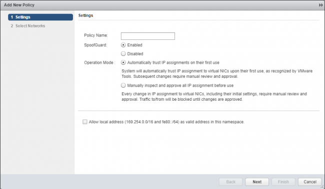 - Enter the Policy Name, select SpoofGuard to be Enabled or Disabled, select required Operation Mode and click Next.