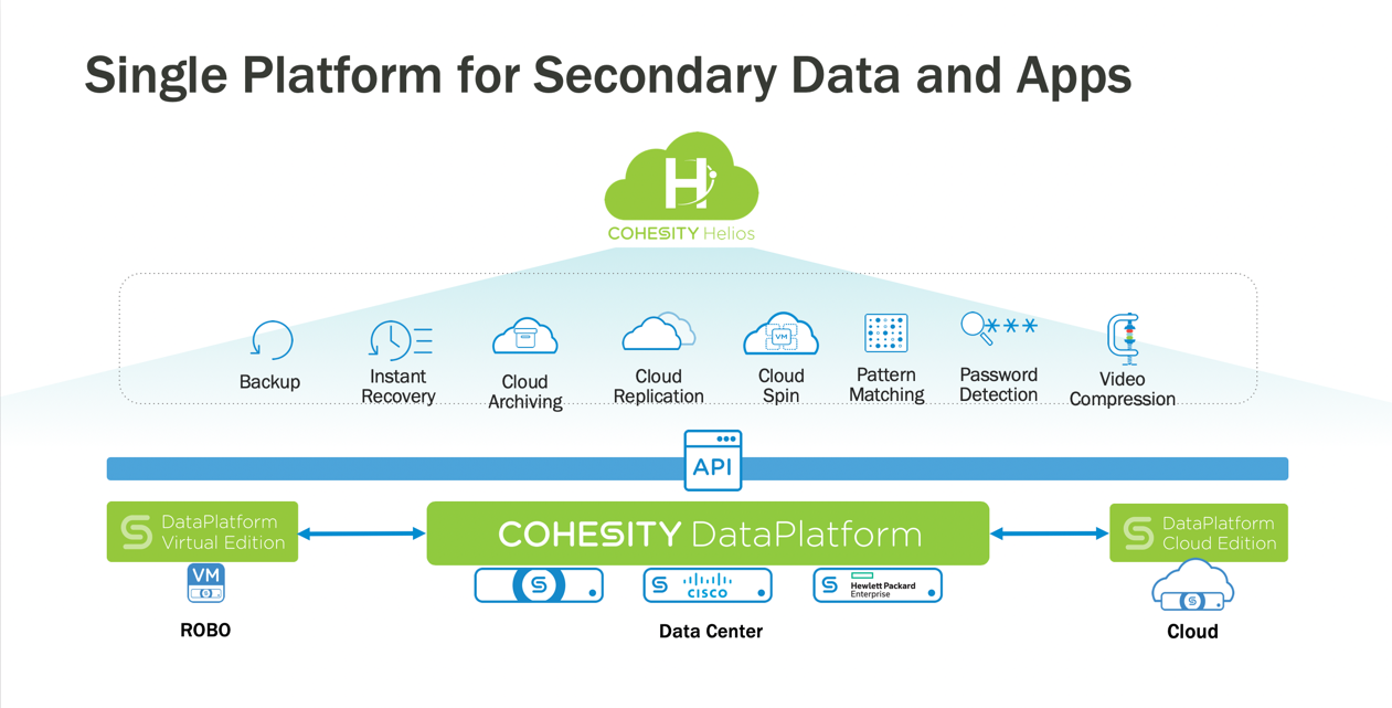 The Cohesity DataPlatform provides a single platform for multiple secondary storage services/functions, including Backup, Instant Recovery and Cloud Archive. This is provided in 3 different editions (Virtual, Cloud or Physical) with full feature parity between them that enables a consistent API-driven approach across the different clouds, Private or Public. The platform supports NFS, SMB and S3.
