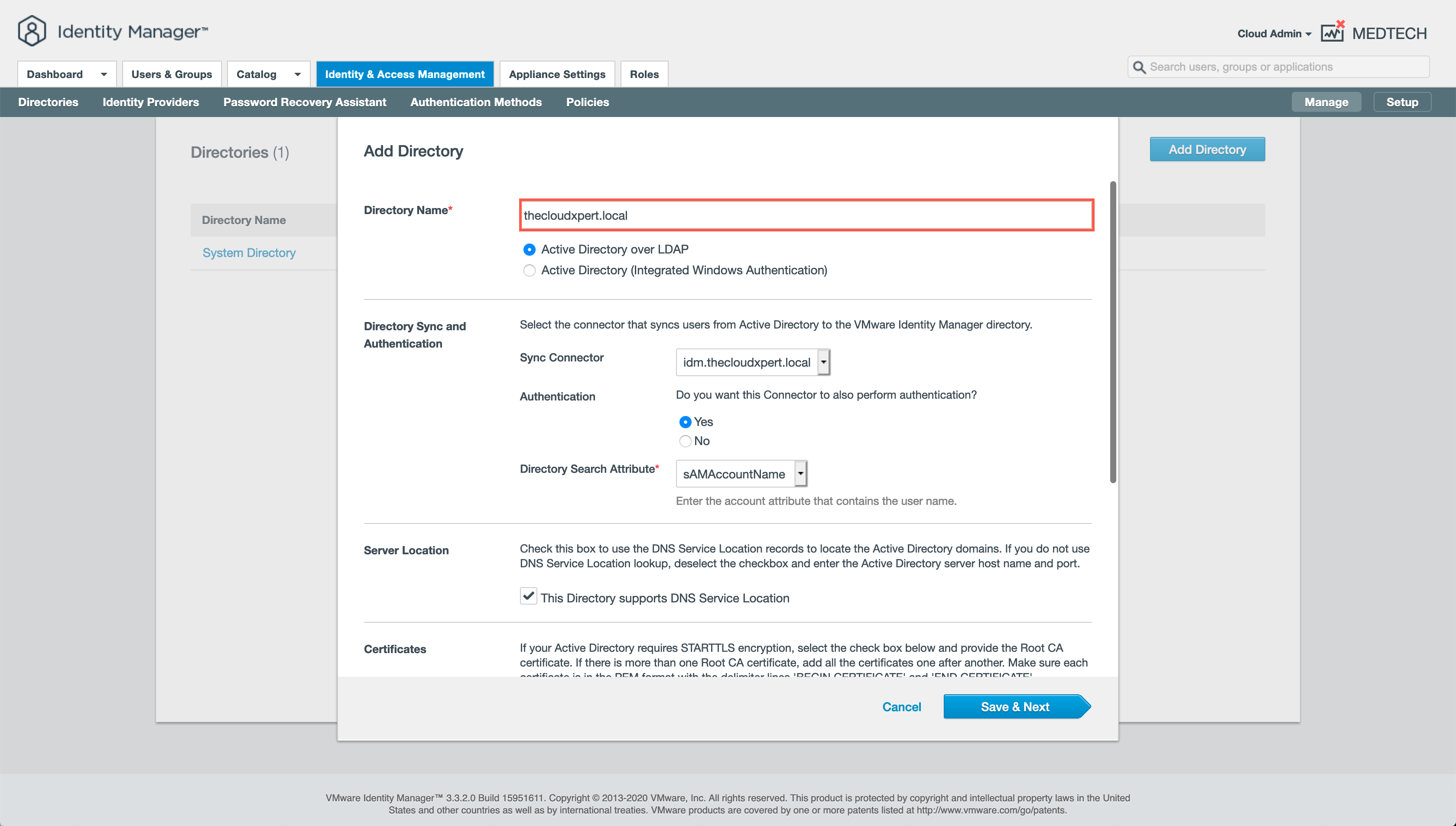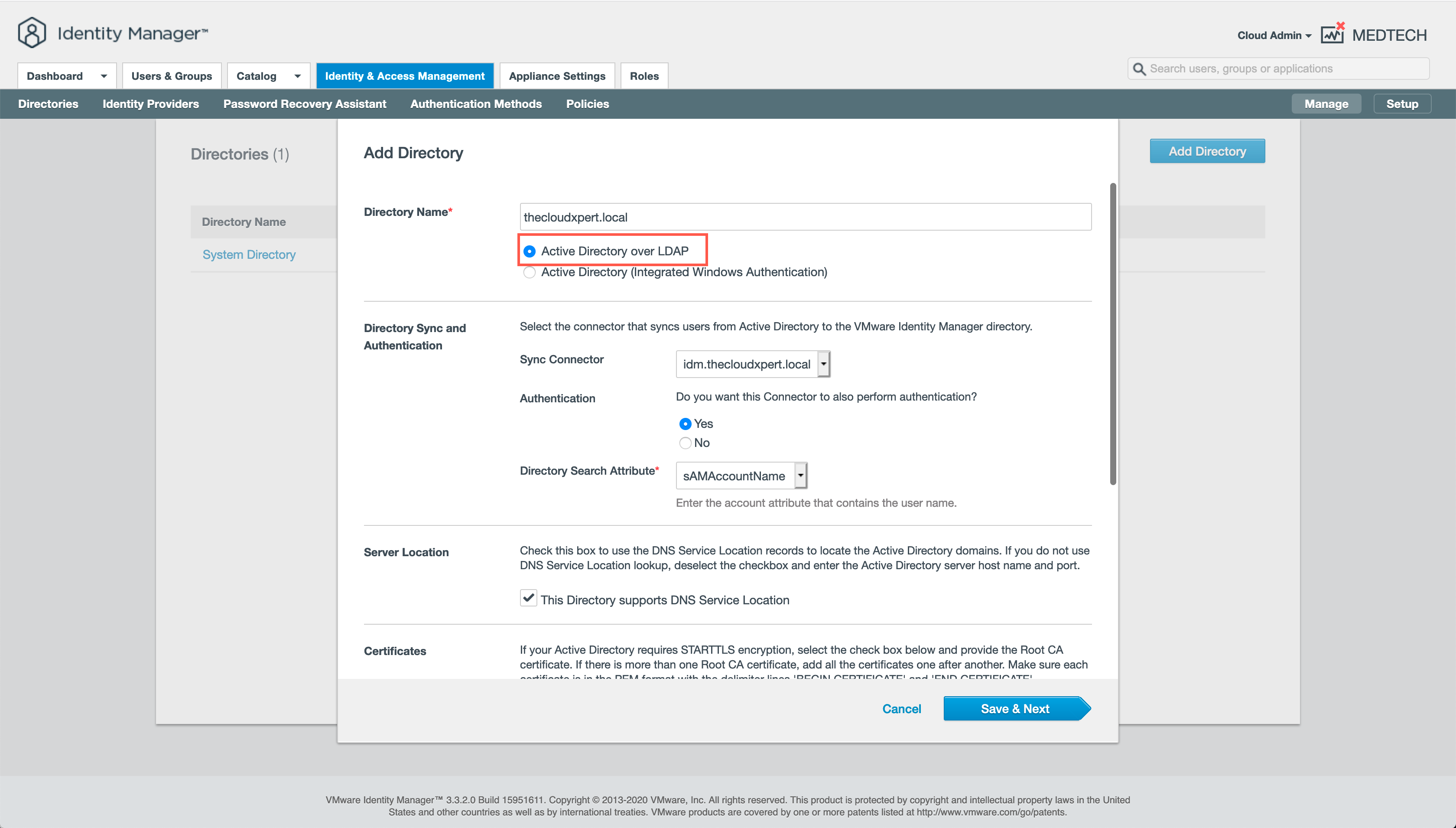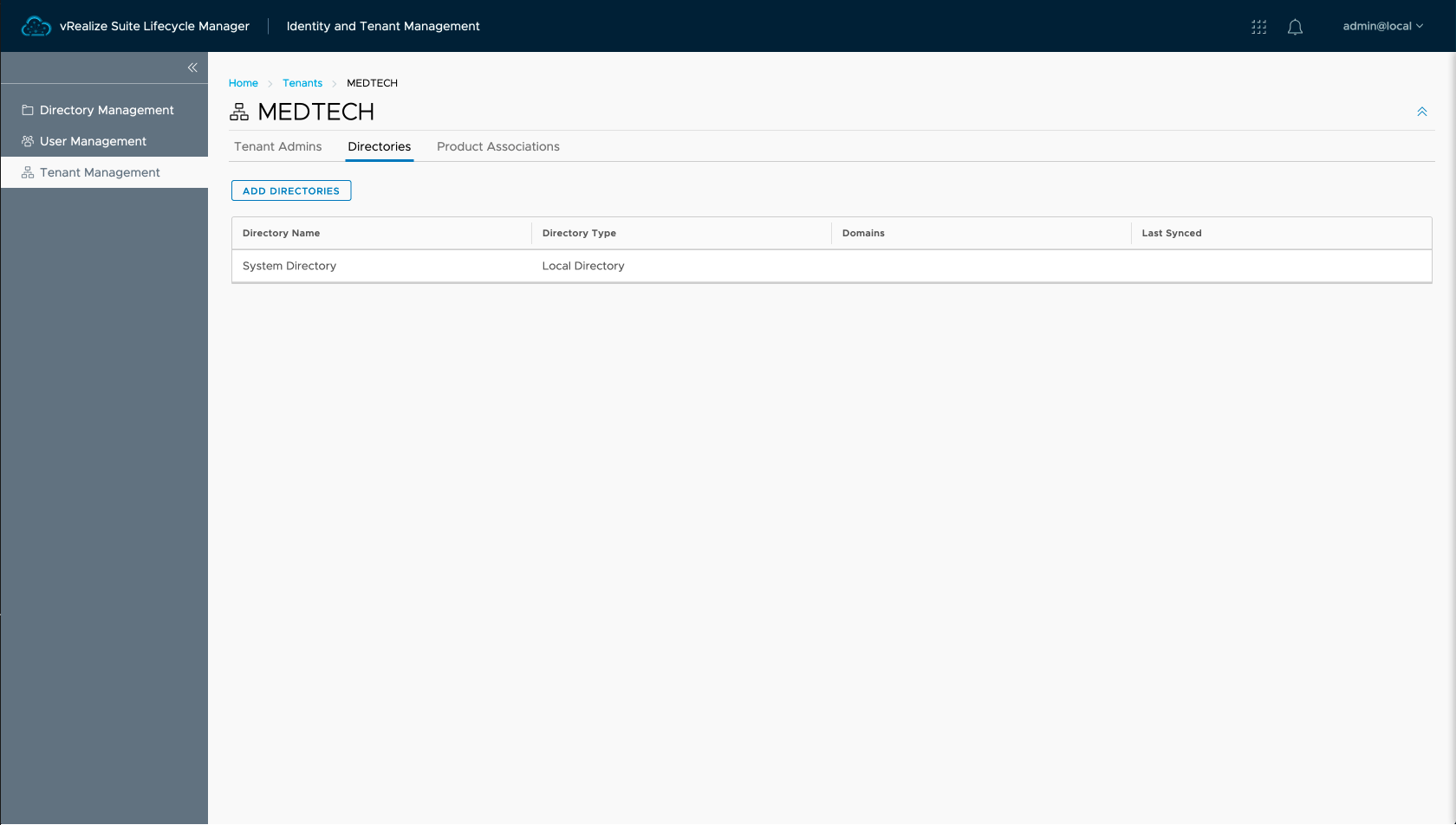We’re going to be adding new User Directories to the MedTech Organization we created previously. This objective can be completed using vRSLCM. Obviously using vRSLCM potentially means that your provider tenant needs to have a number of customer Active Directories (based on your requirements) configured.