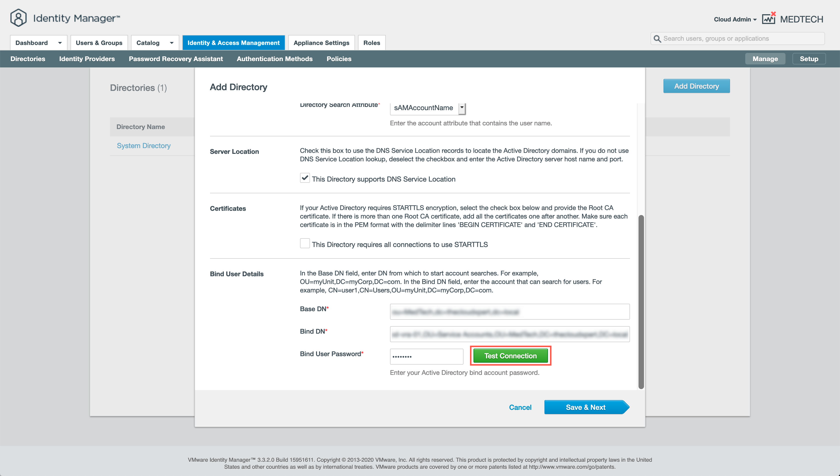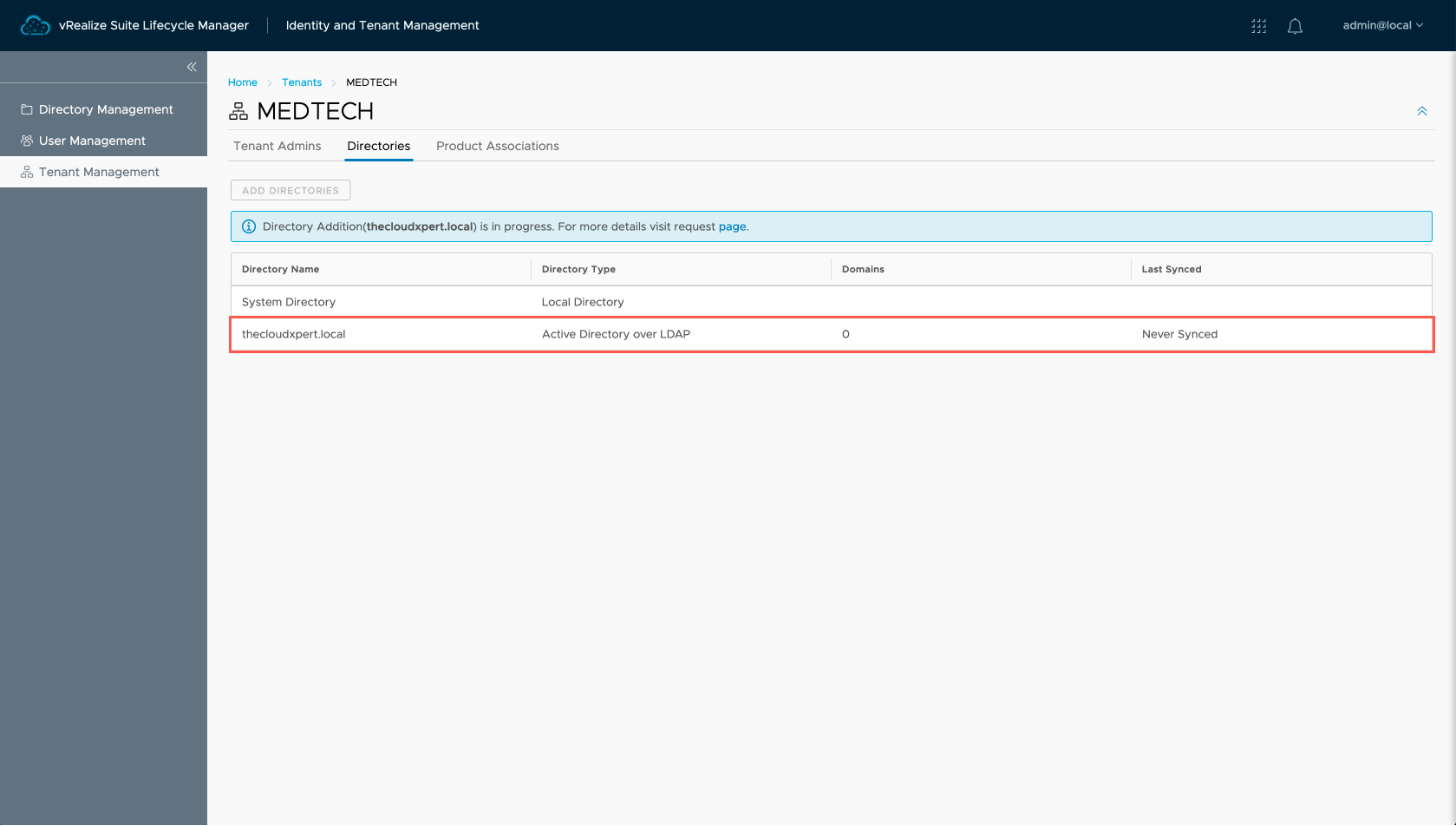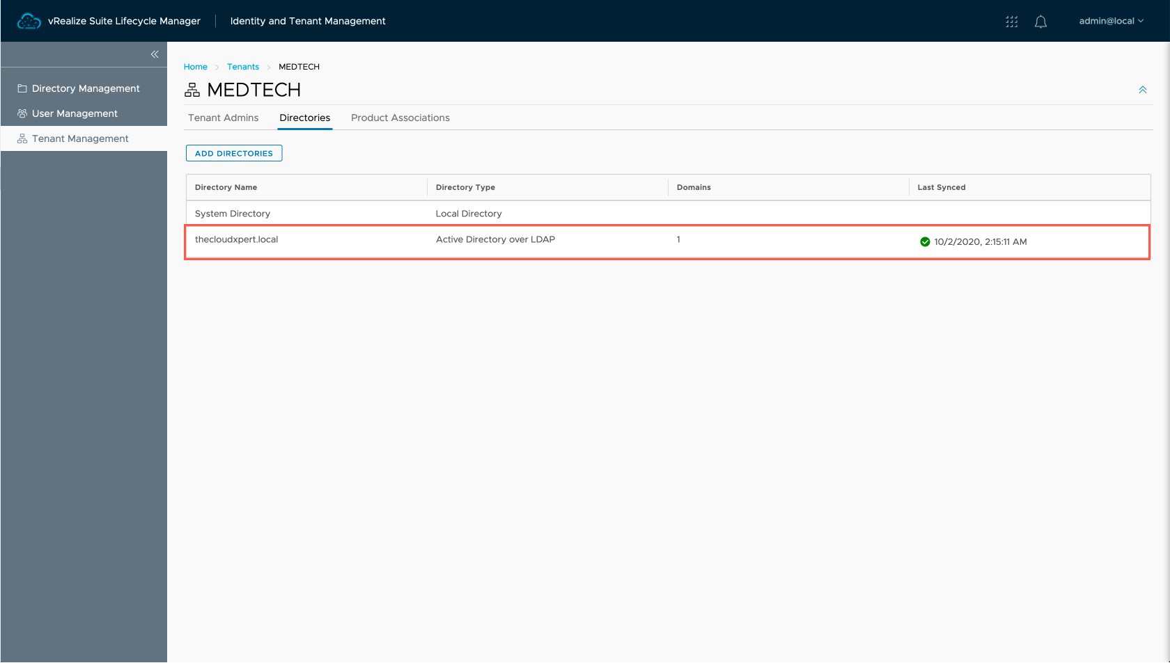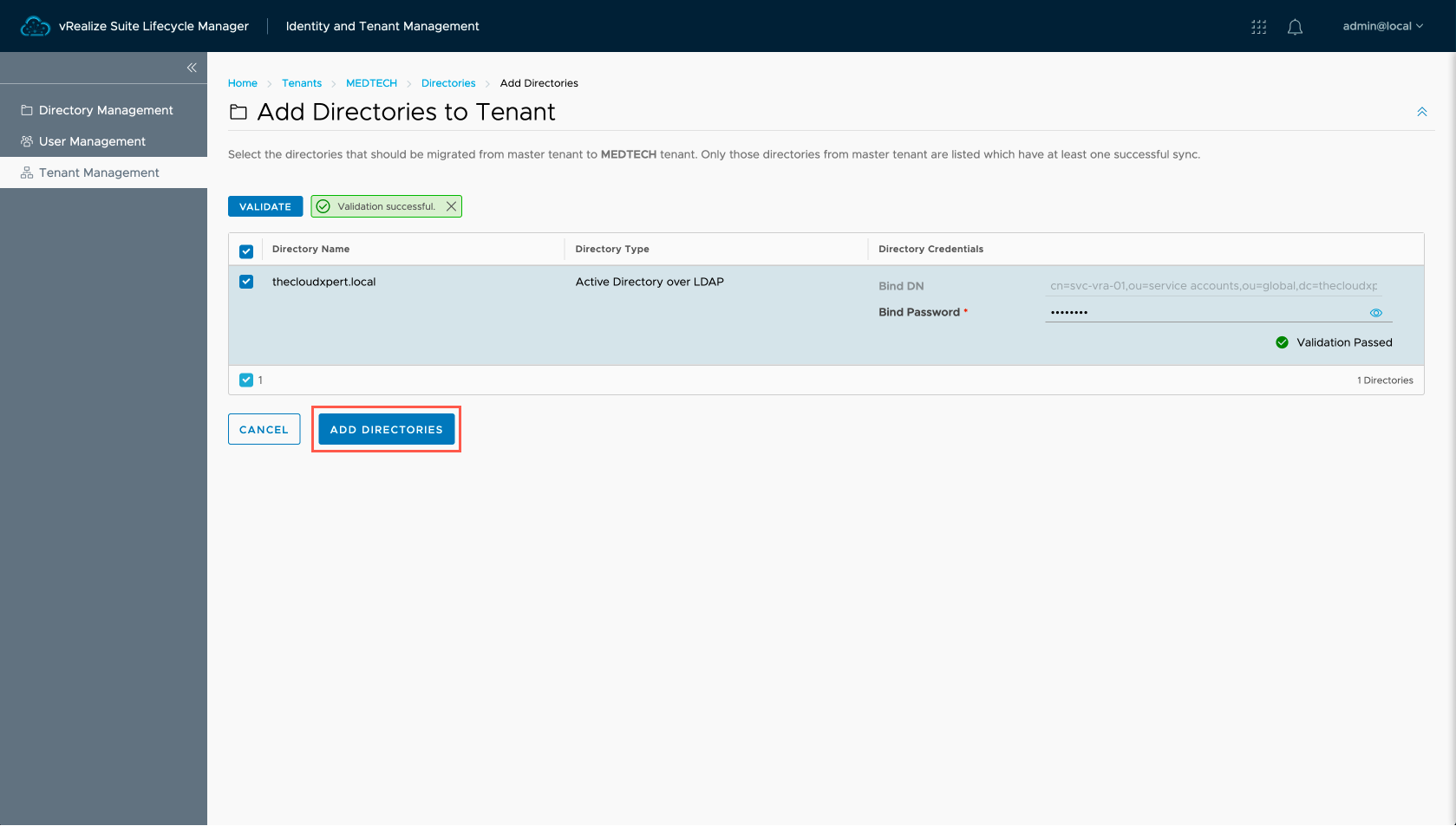 Again, we can switch back the vRSLCM and see the new User Directory in the MedTech Tenant.