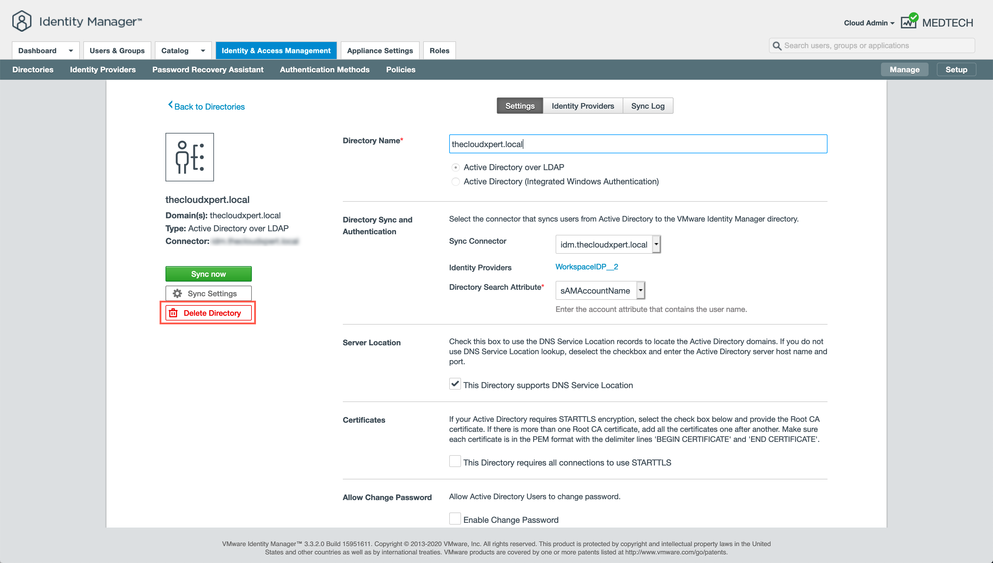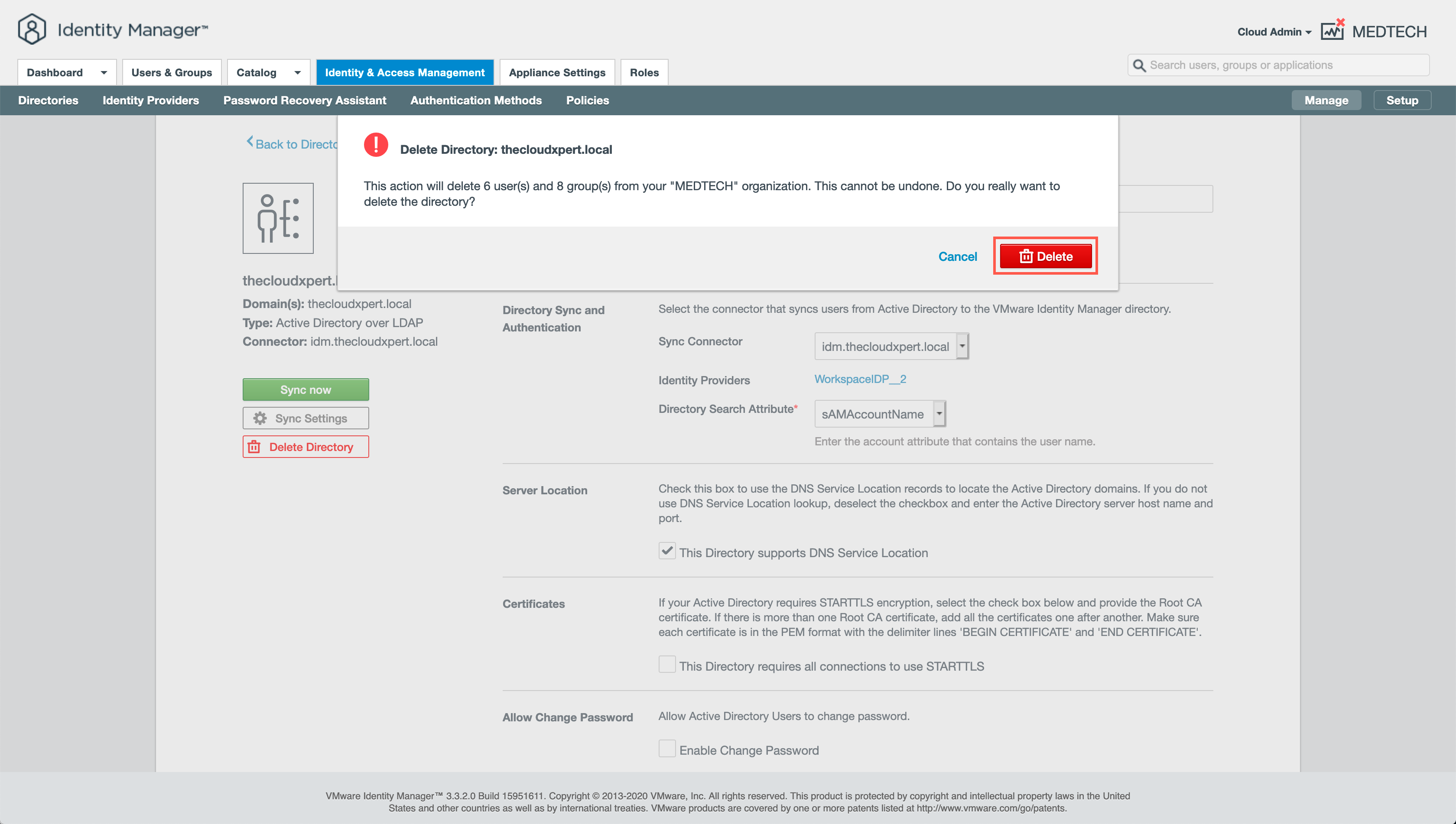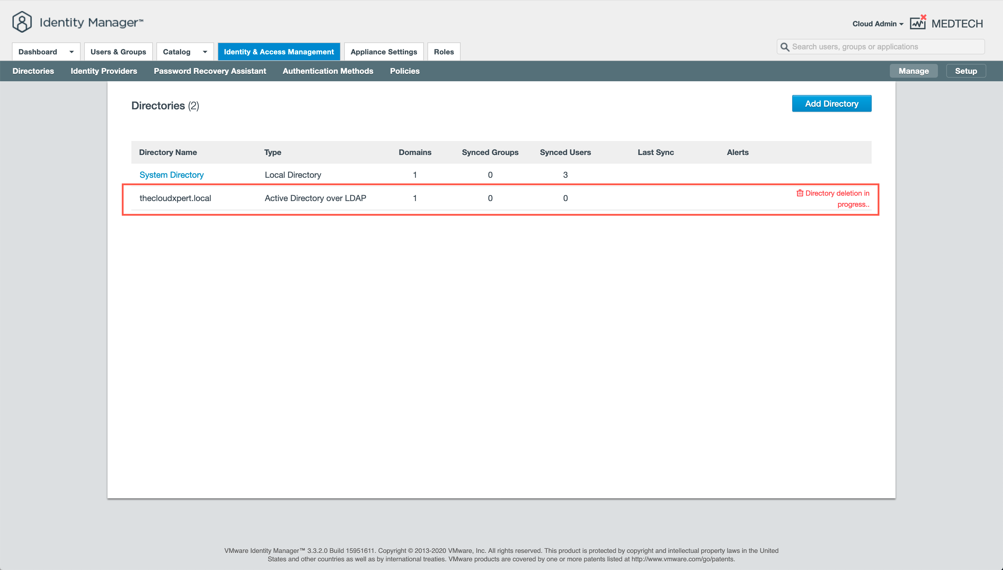 - Deleting a User Directory from the Customer Tenant using VMware Identity Manager.