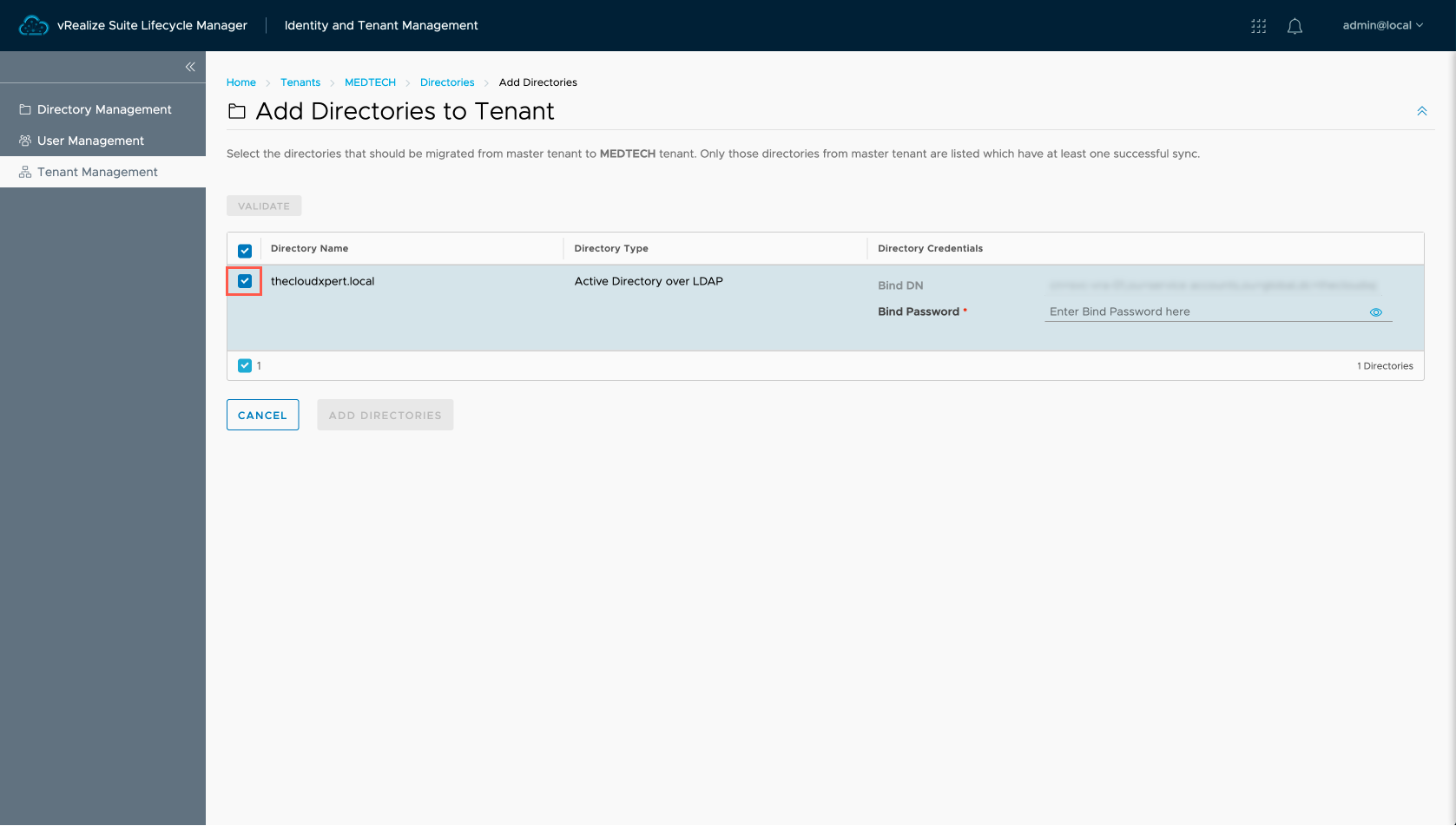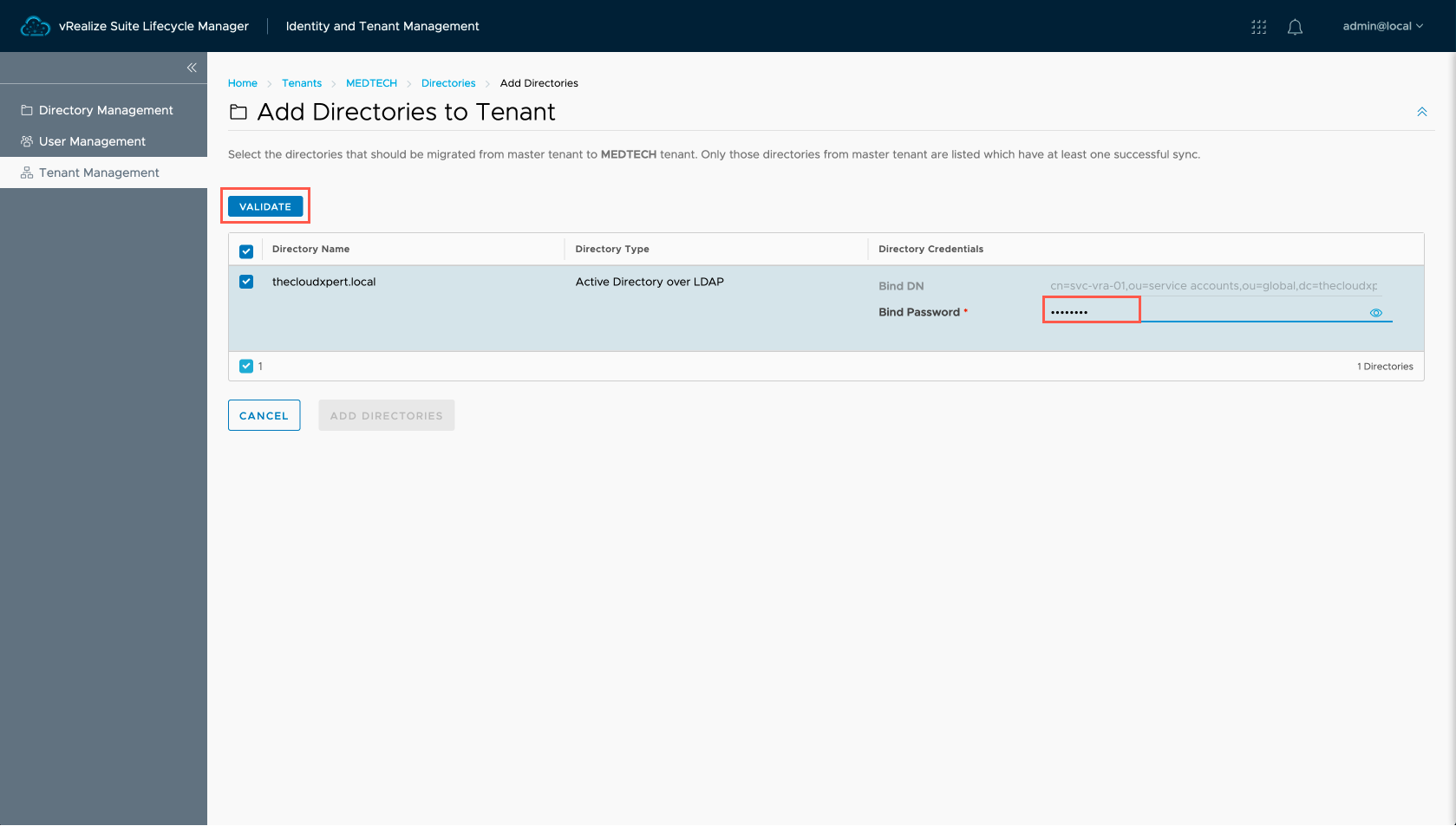 - At the Add Directories to Tenant screen, enter the Bind Password into the textbox and click VALIDATE.