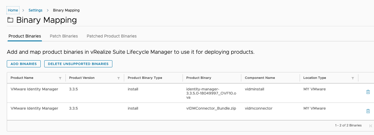 Once the request is completed, if we logged into the vRSLCM appliance (and navigate to Lifecycle Operations > Settings > Binary Mapping) we will see the that the install OVA for vIDM has been downloaded.