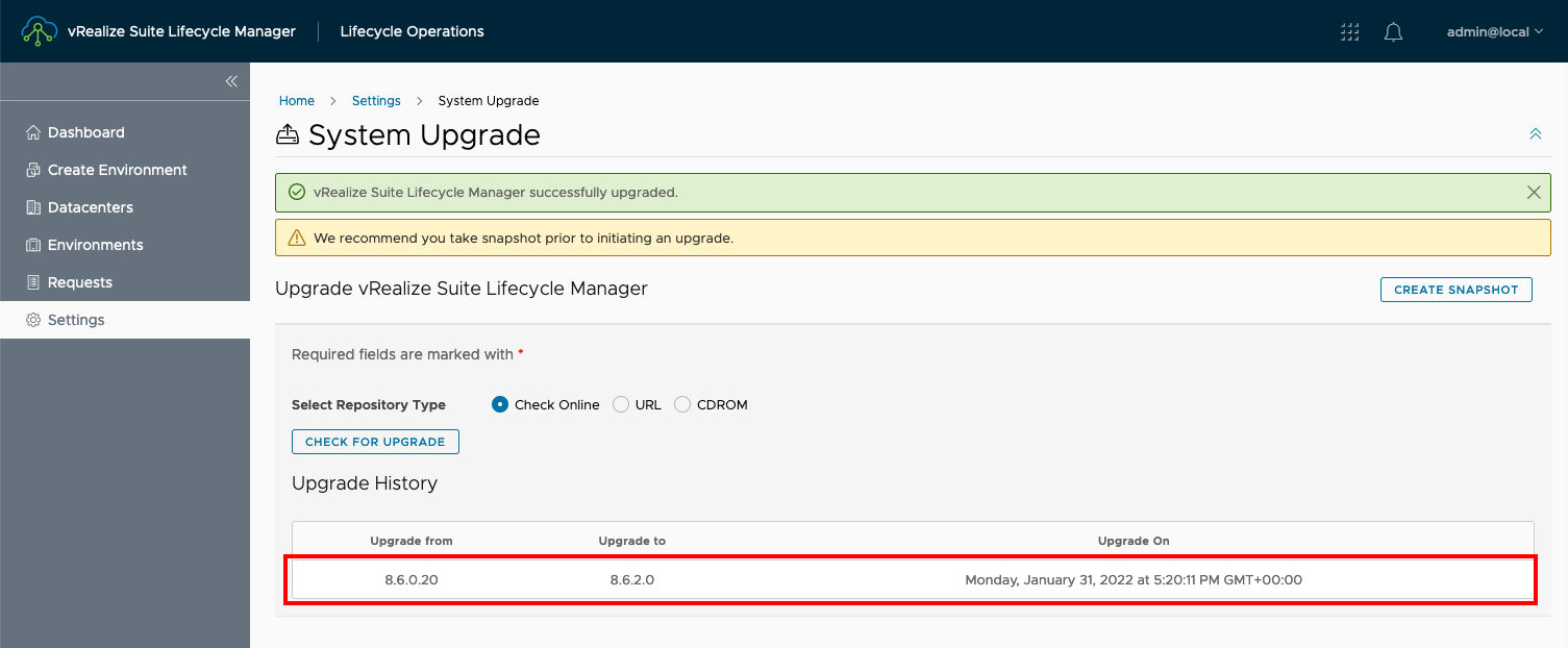 If we logged into vRSLCM using the UI (and navigate to Lifecycle Operations > Settings > System Upgrades), we would now see that vRSLCM has been upgraded: