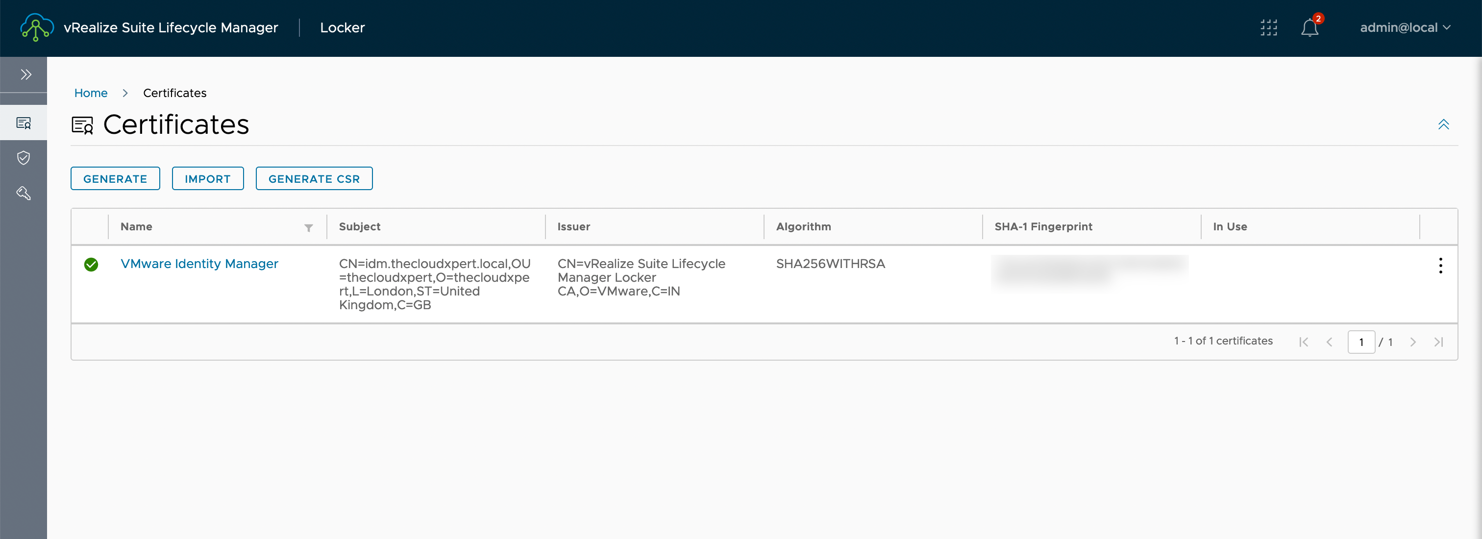 As we can see from the screenshot, a certificate already exists within the vRSLCM locker: