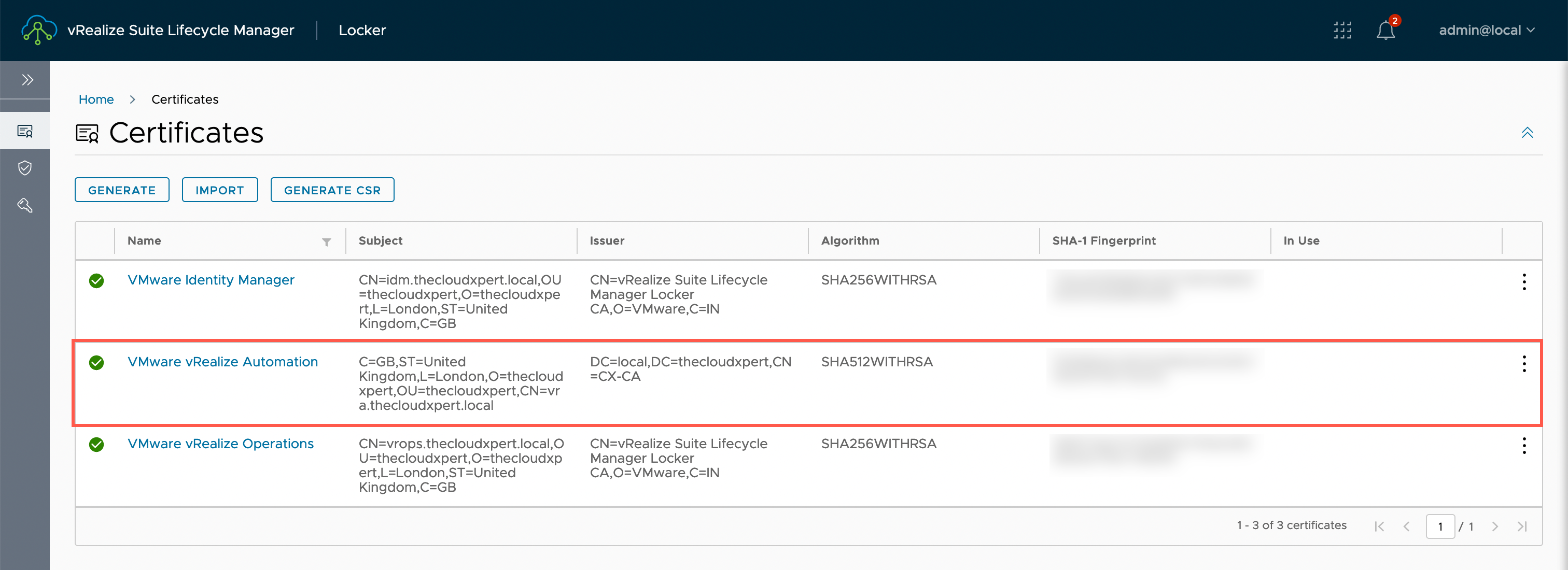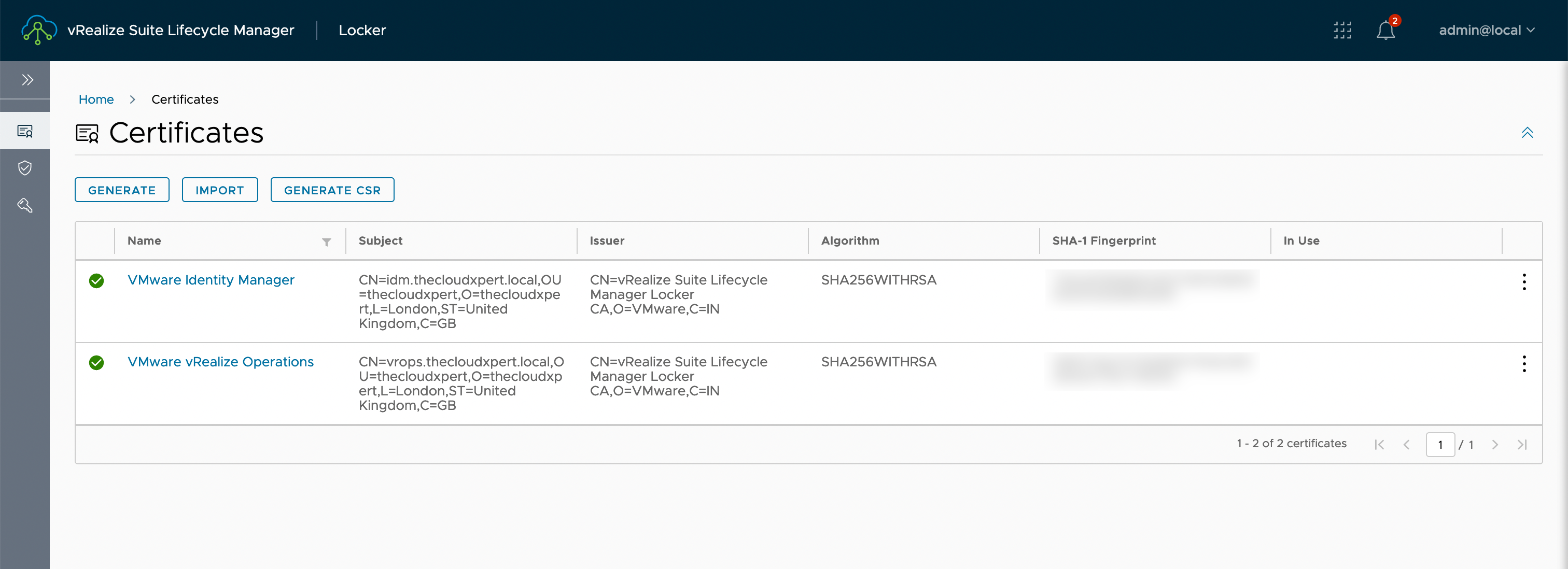 If we logged into vRSLCM using the UI (and navigated to Locker > Certificates), the target certificate would be removed and we would now see the following certificates configured: