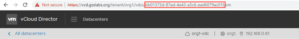 - vdcId - The VMware Cloud Director Virtual Datacenter Id. Which I obtain this by logging into VMware Cloud Director, clickingon the target Virtual Datacenter and then took the value from the URL. In my environment the URL was: