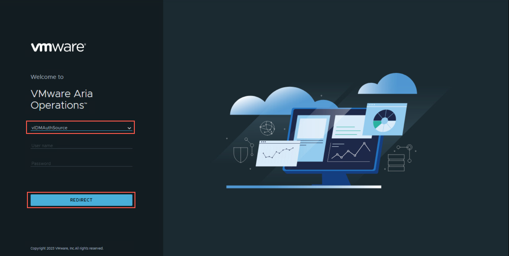 - From the Welcome Page, select vIDMAuthSource from the dropdown and click REDIRECT.
