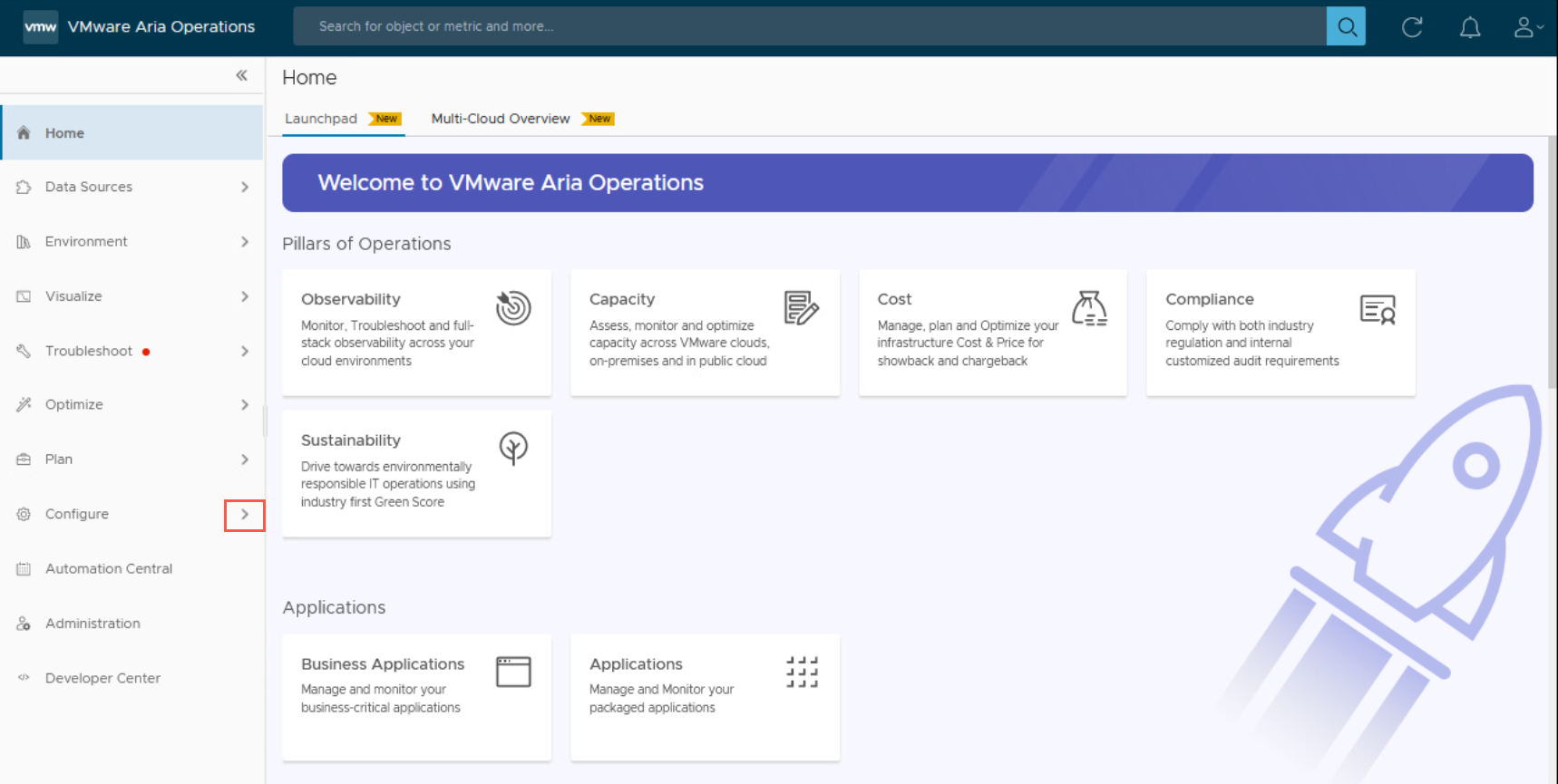 - At the Welcome to VMware Aria Operations page, click > to expand Configure.