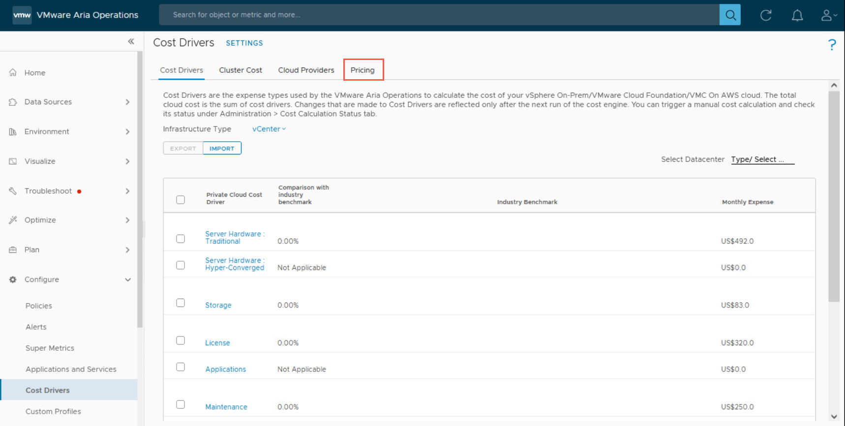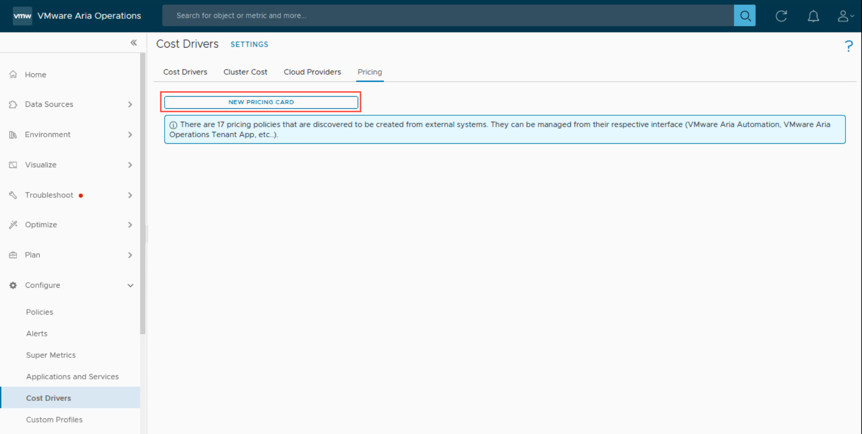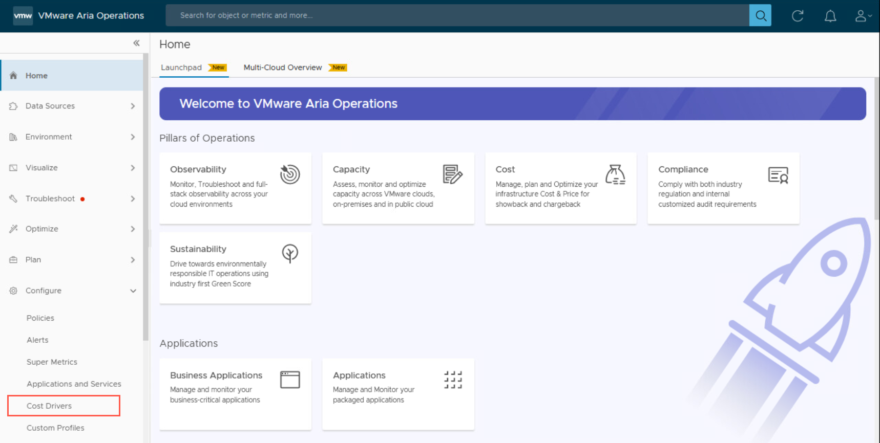 - At the Welcome to VMware Aria Operations page, under Configure, click Cost Drivers.