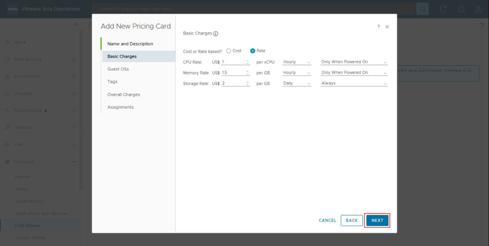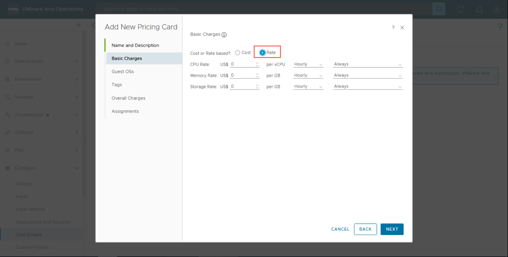 - At the Add New Pricing Card dialog, under Basic Charges, from the Cost or Rate based? options select Rate.