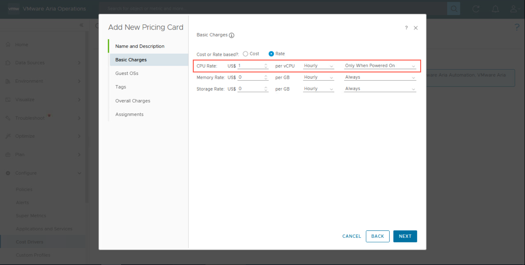 - At the Add New Pricing Card dialog, under Basic Charges, complete the following for the CPU Rate: