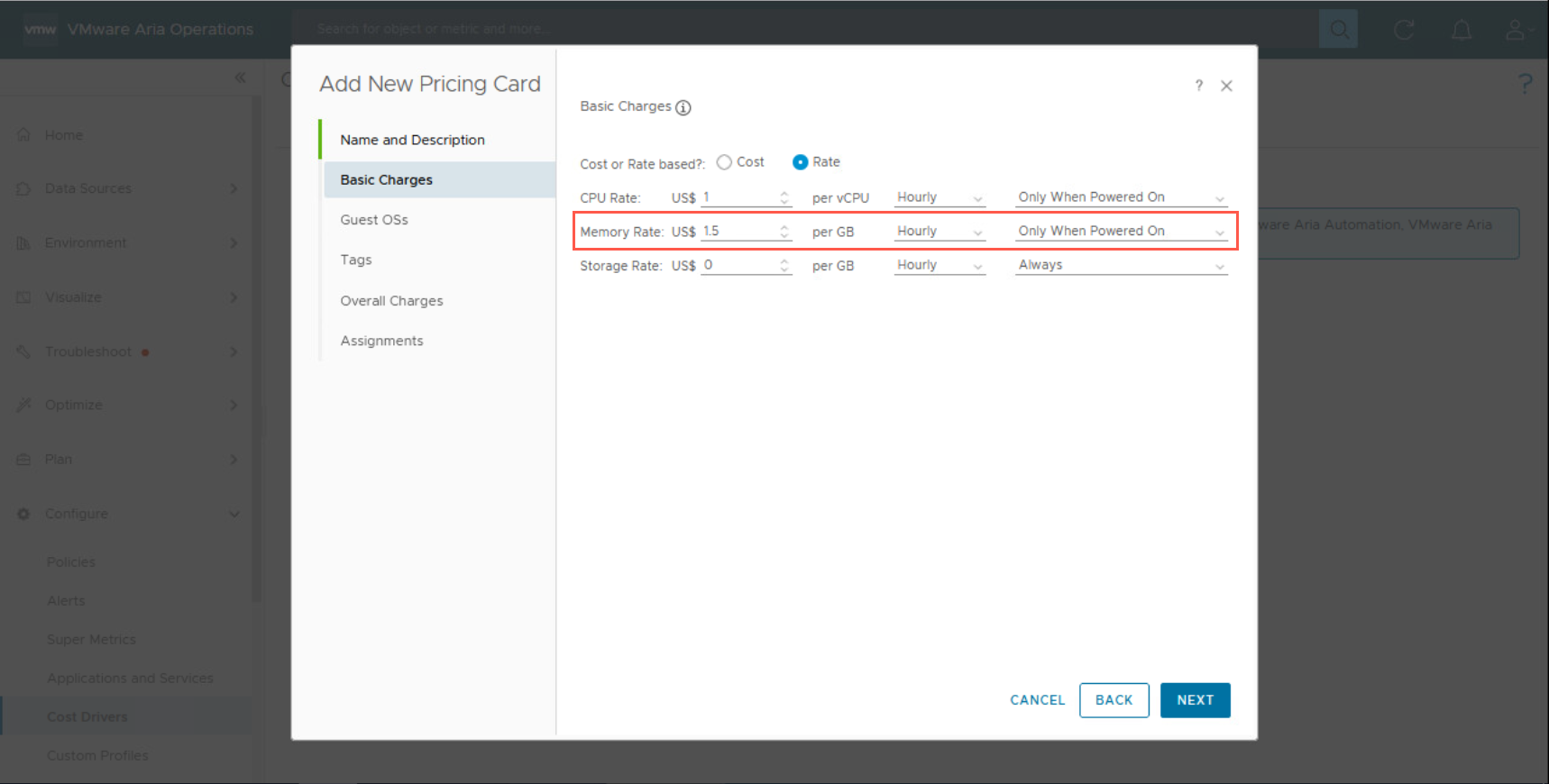 - At the Add New Pricing Card dialog, under Basic Charges, complete the following for the Memory Rate: