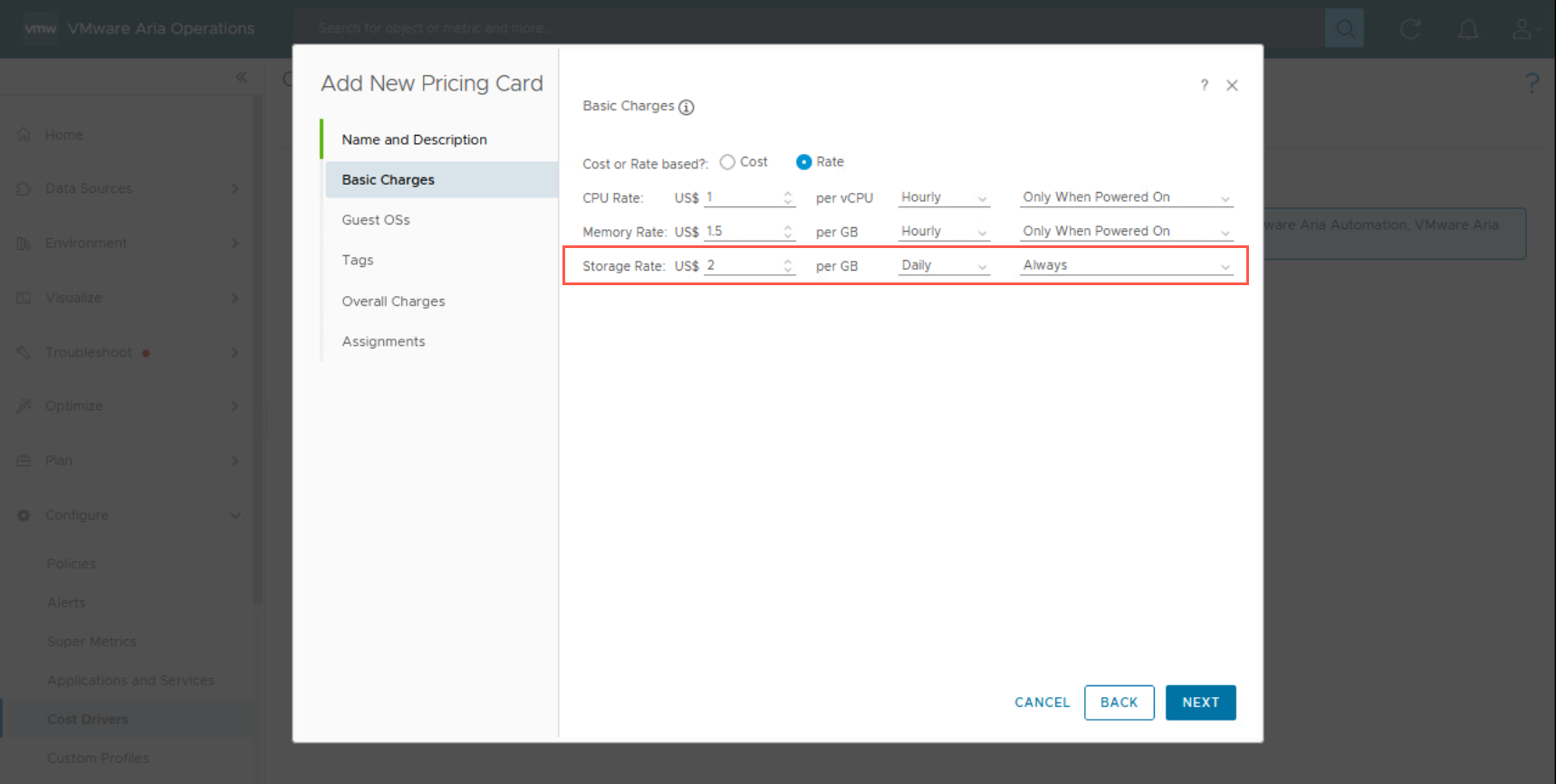 - At the Add New Pricing Card dialog, under Basic Charges, complete the following for the Storage Rate: