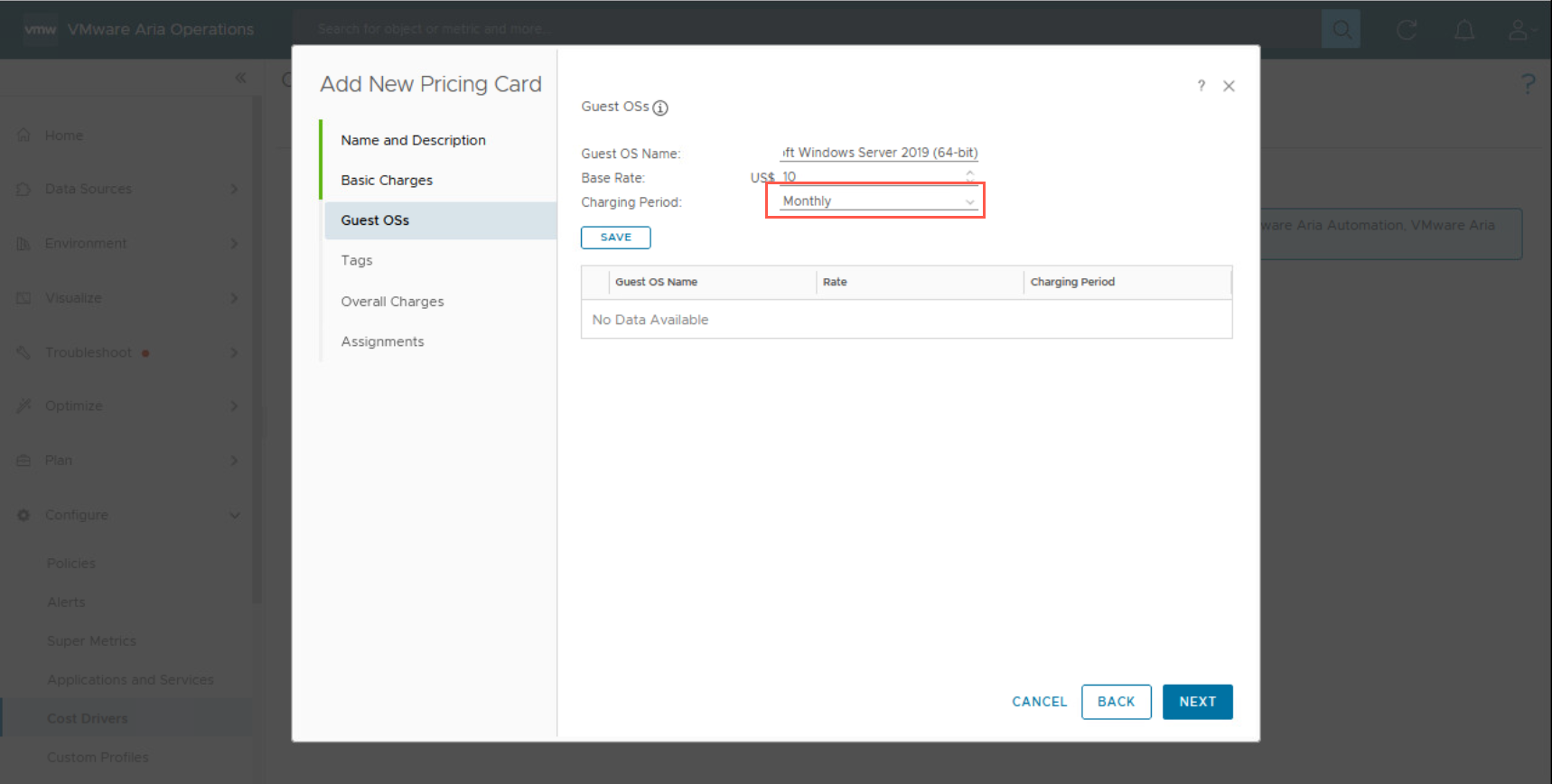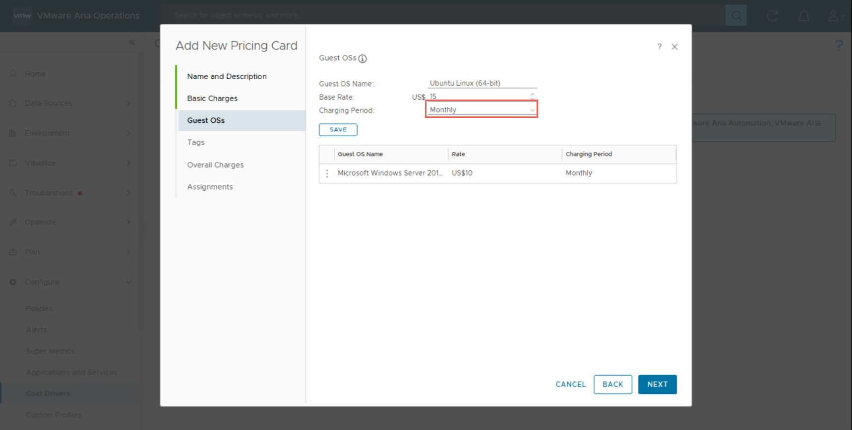 into the Base Rate field. - At the Add New Pricing Card dialog, under Guest OSs, select Monthly from the Charging Period dropdown.