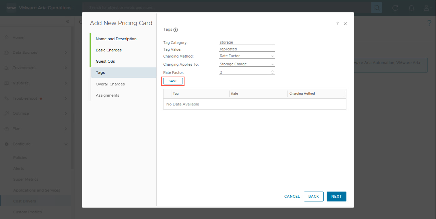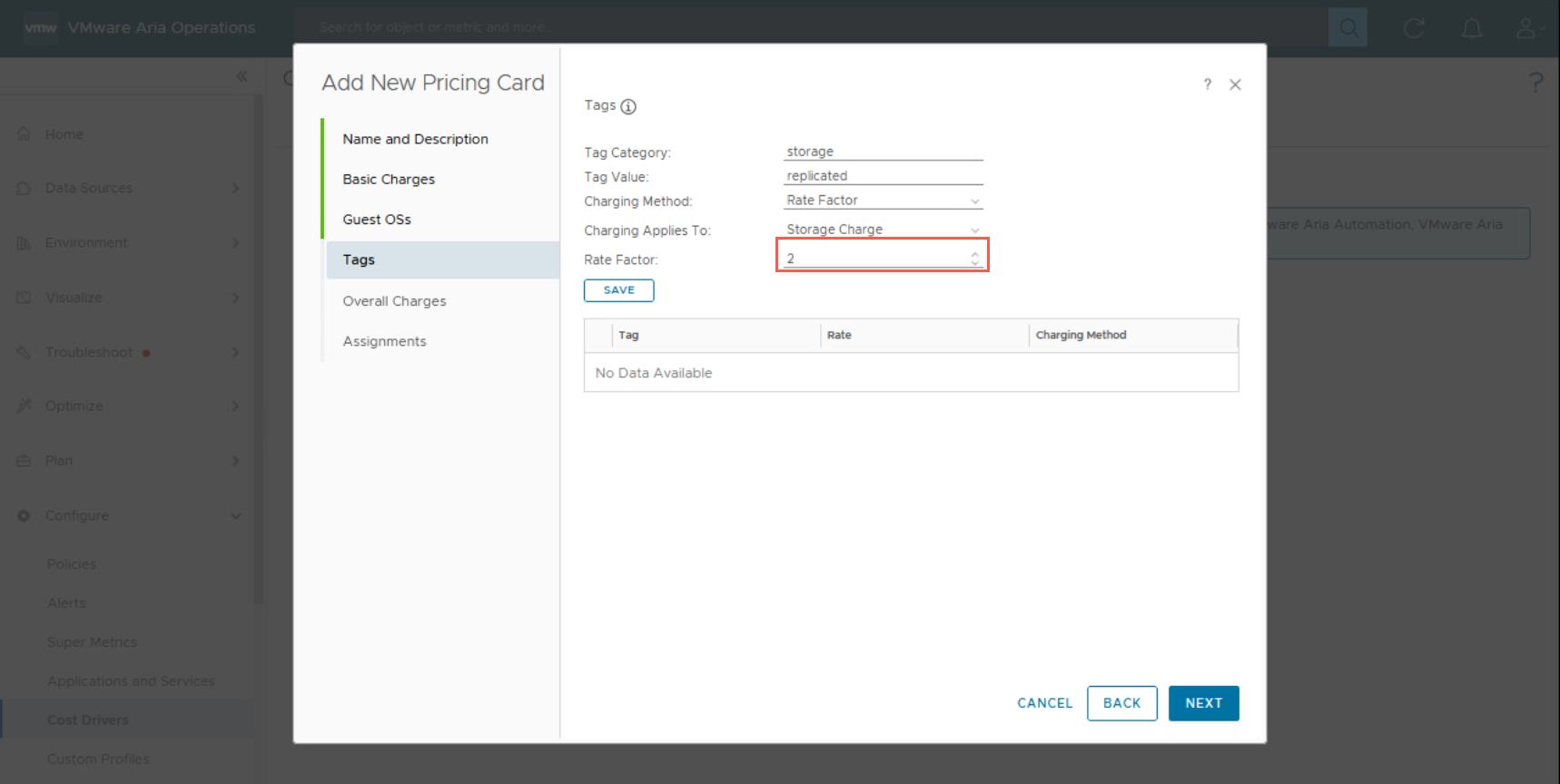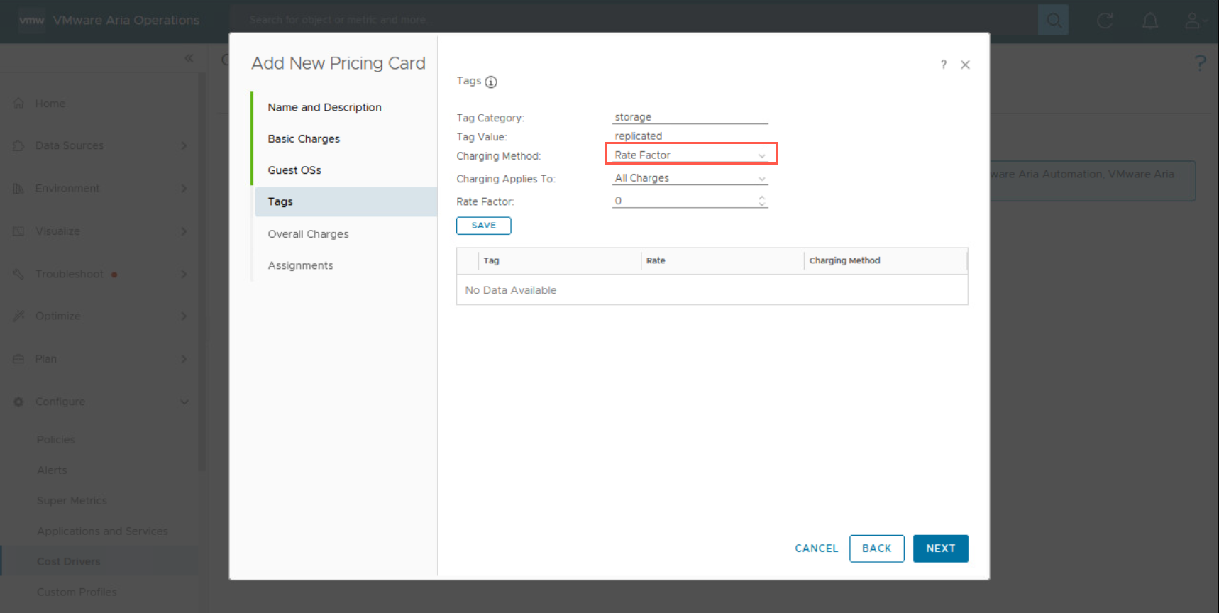 into the Tag Value field. - At the Add New Pricing Card dialog, under Tags, select Rate Factor from the Charging Method dropdown.