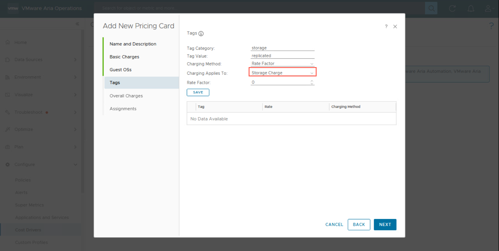 - At the Add New Pricing Card dialog, under Tags, select Storage Charge from the Charging Applies To dropdown.