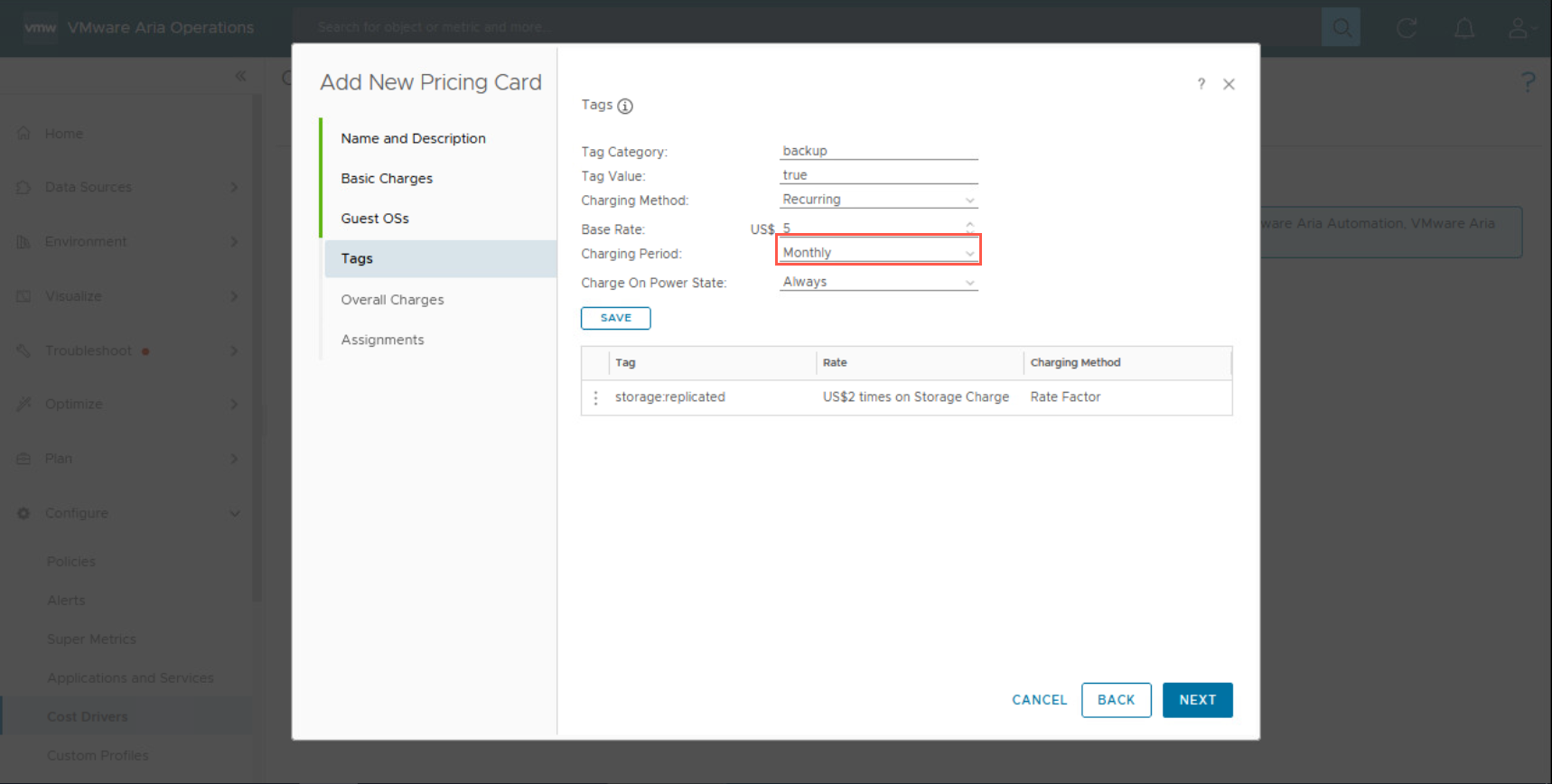 into the Base Rate field. - At the Add New Pricing Card dialog, under Tags, select Monthly from the Charge period dropdown.