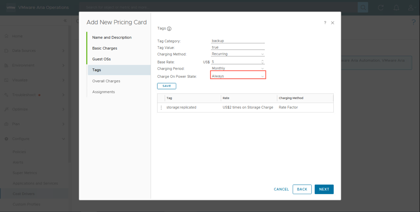 - At the Add New Pricing Card dialog, under Tags, select Always from the Charge on power state dropdown.