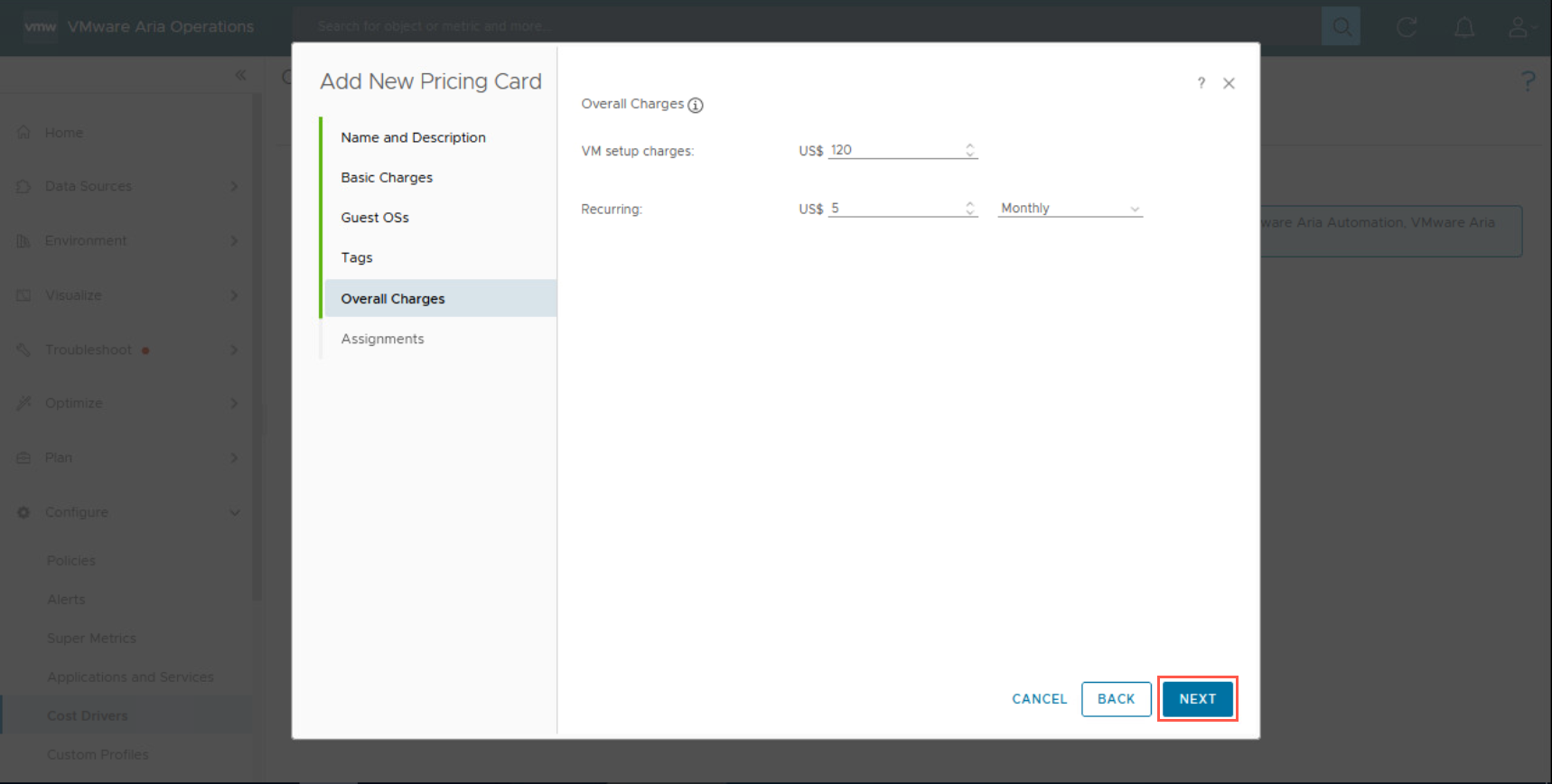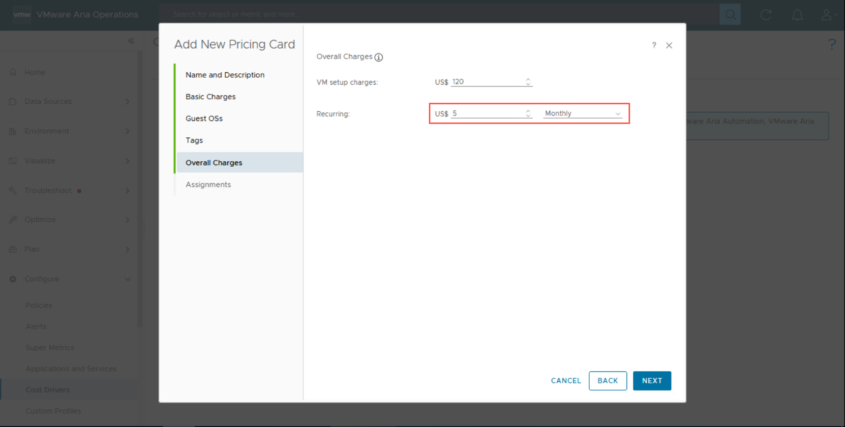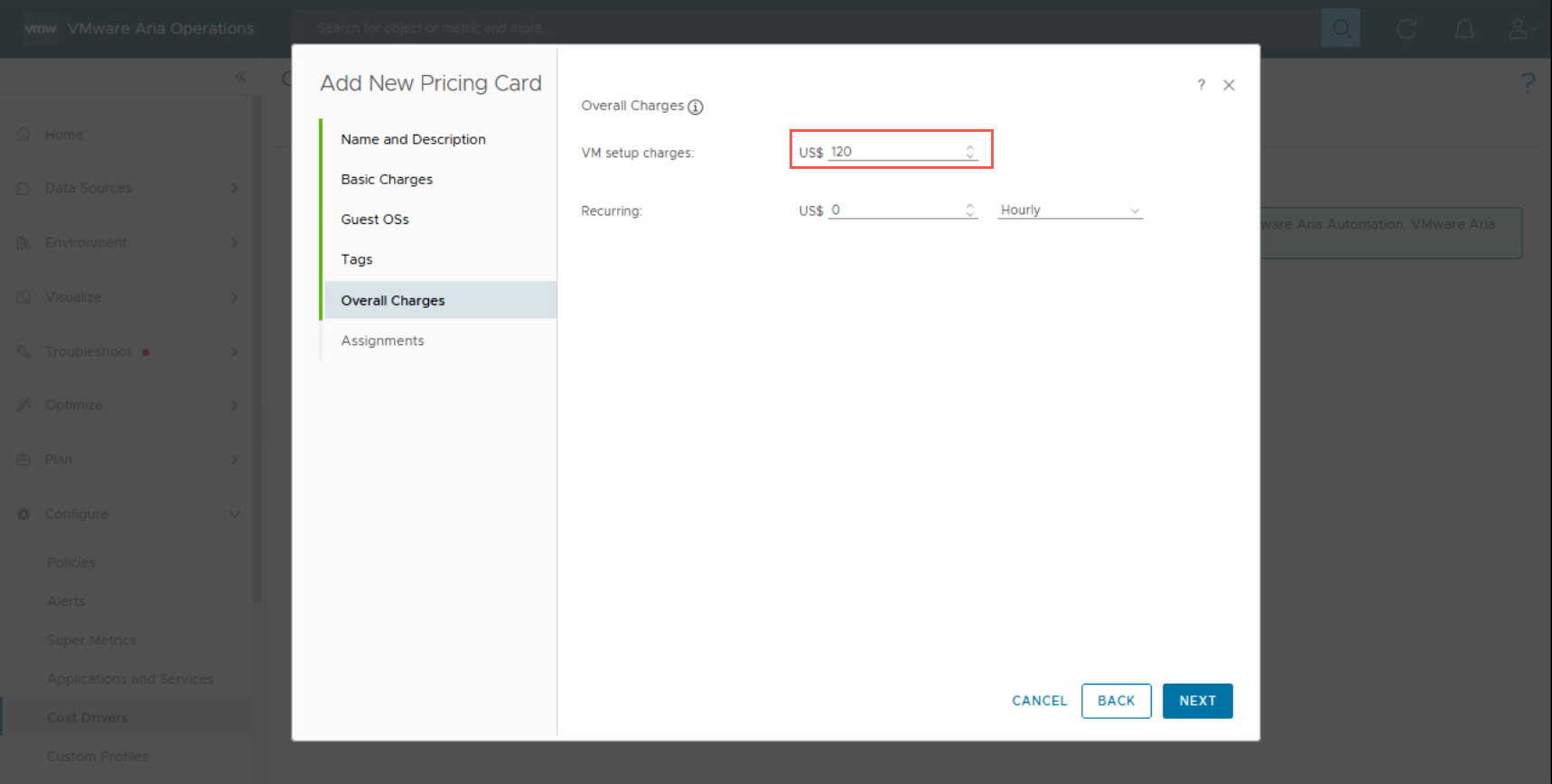 into the VM setup charges field. - At the Add New Pricing Card dialog, under Overall Charges, type
