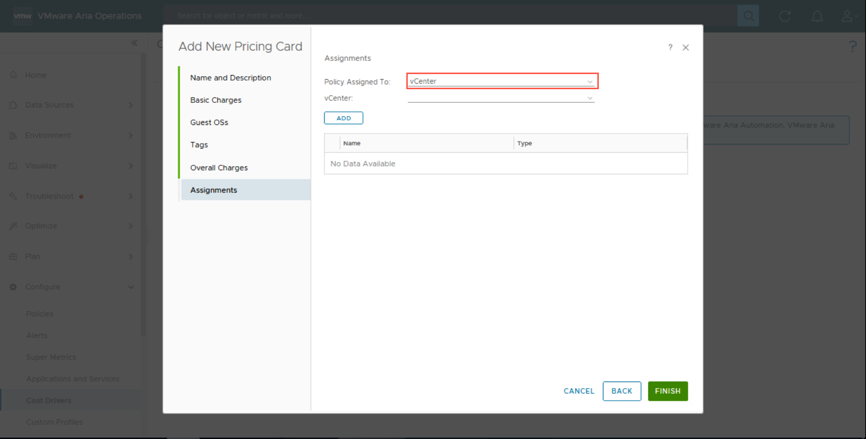 - At the Add New Pricing Card dialog, under Assignments, select vCenter from the Policy Assigned To dropdown.