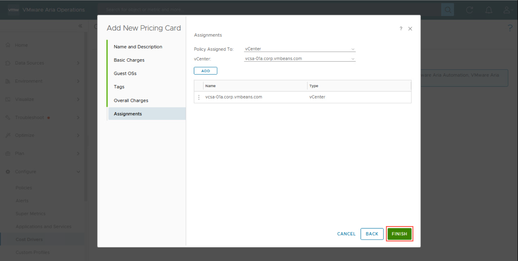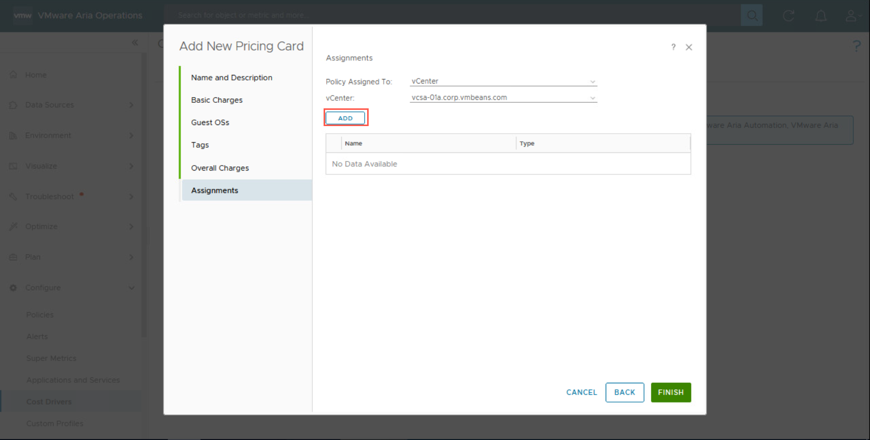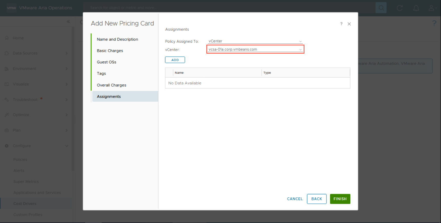 - At the Add New Pricing Card dialog, under Assignments, select vcenter.fqdn from the vCenter dropdown.