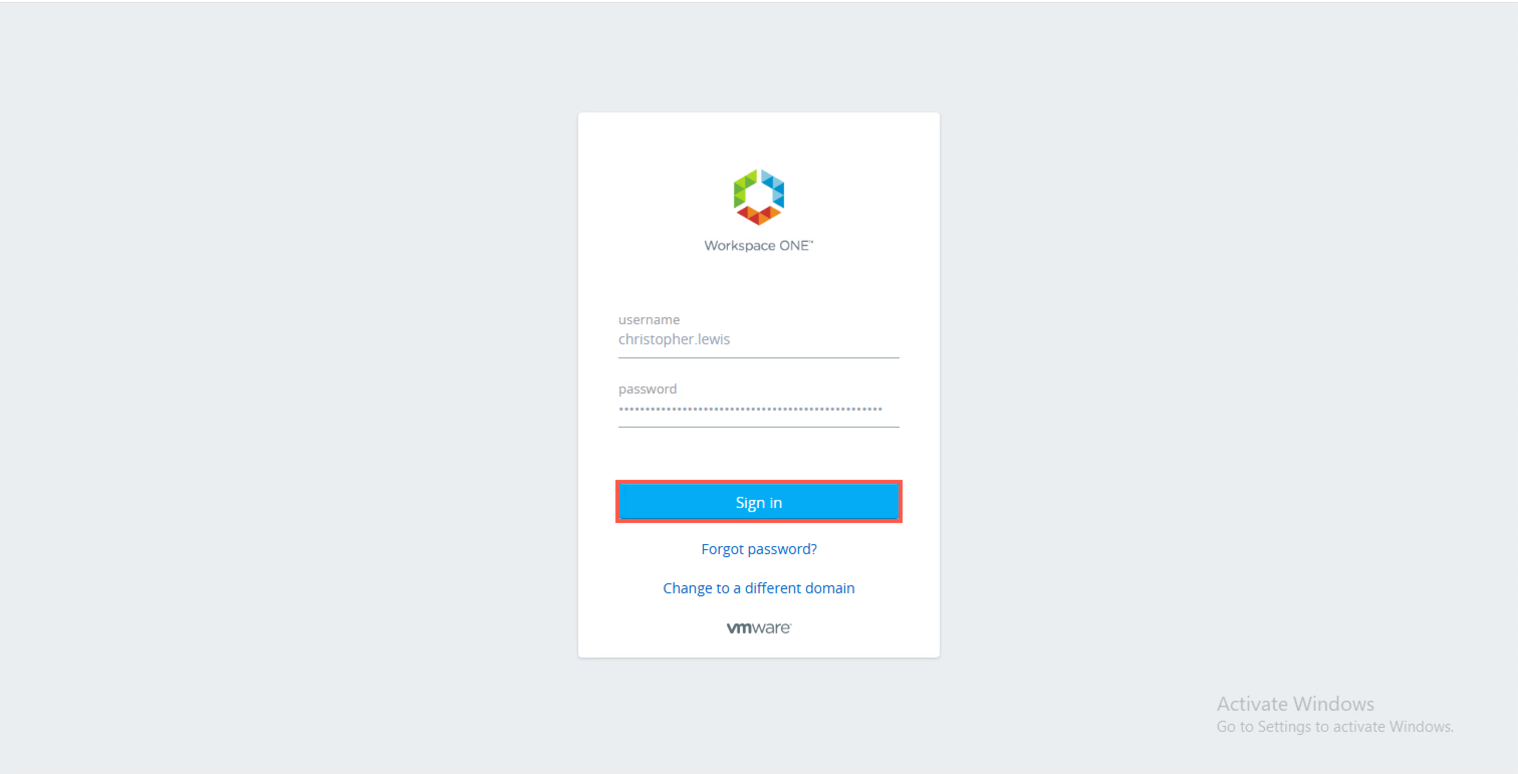 - At the VMware Identity Manager login, enter the cloud administrative user and click Sign in.