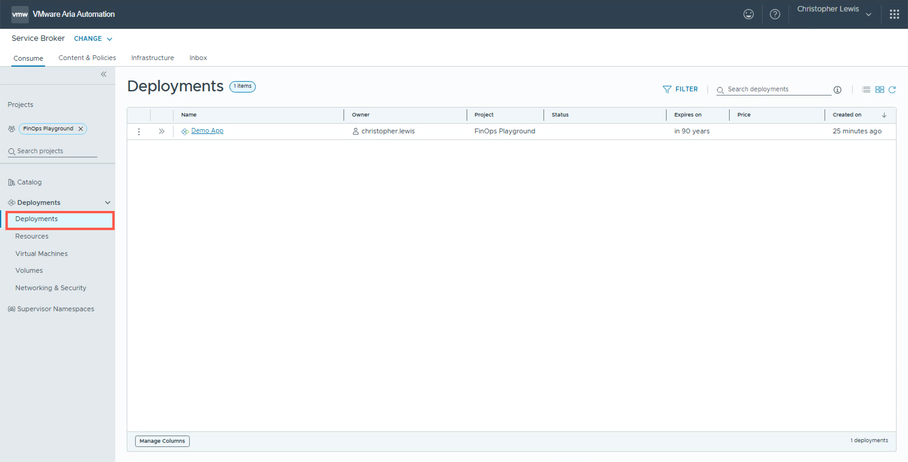- At the Consume screen, click Deployments to show all deployments available to the administrative user.
