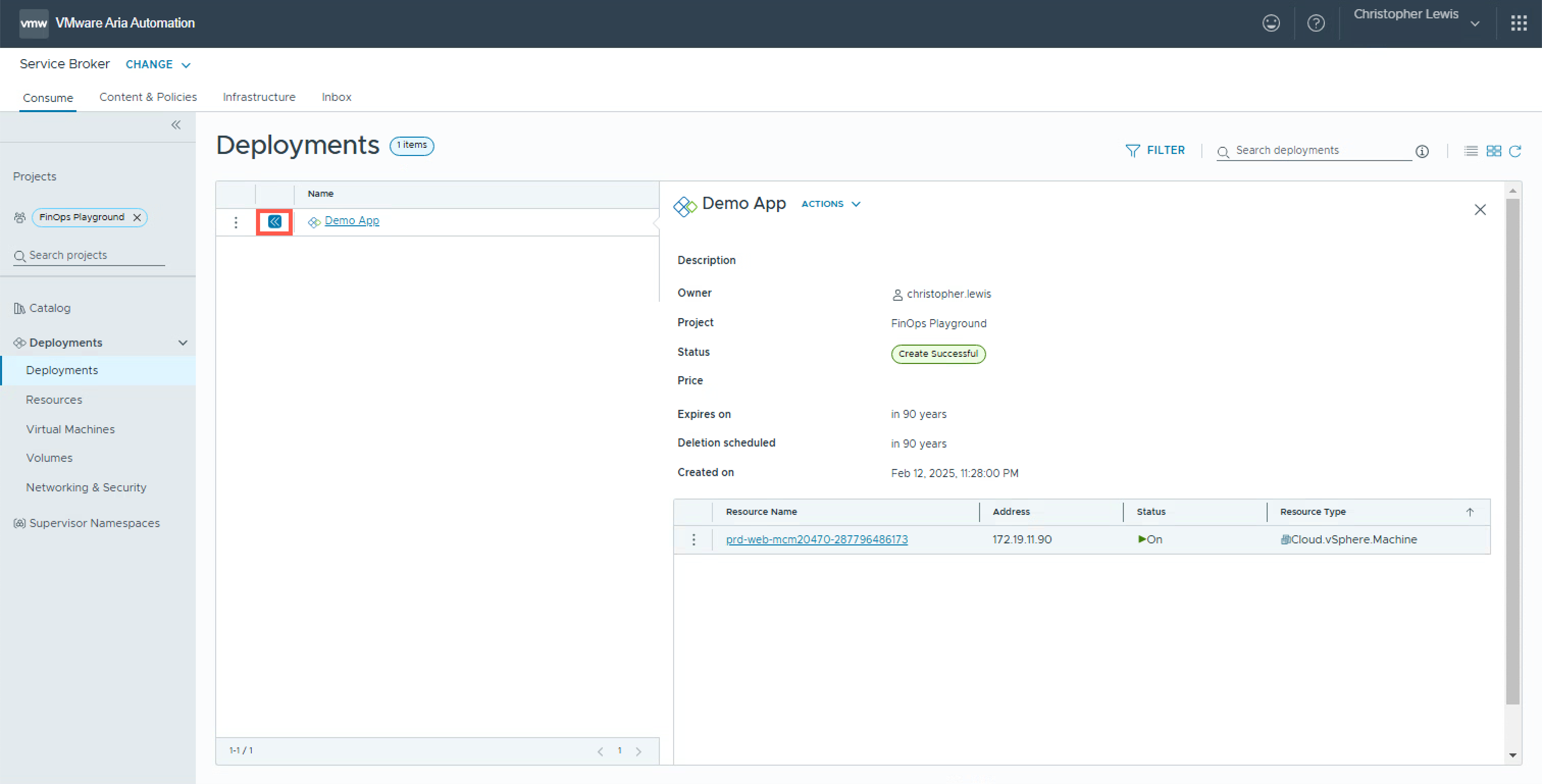 - At the Deployments Screen, locate the demo deployment and click » to expand the view to show resources within.