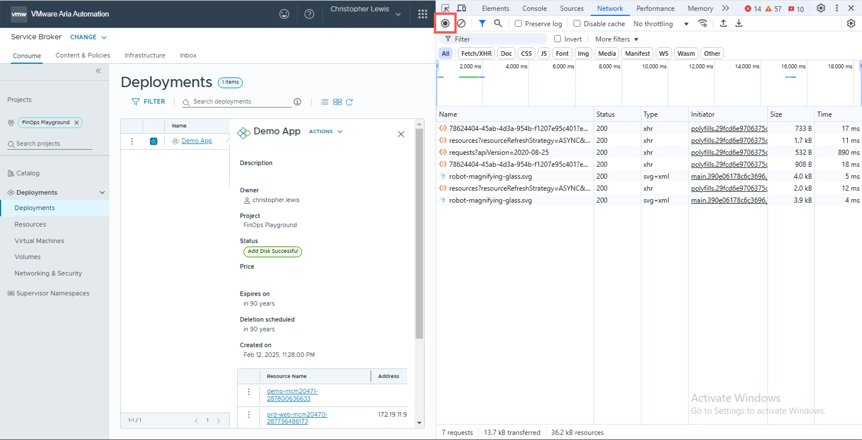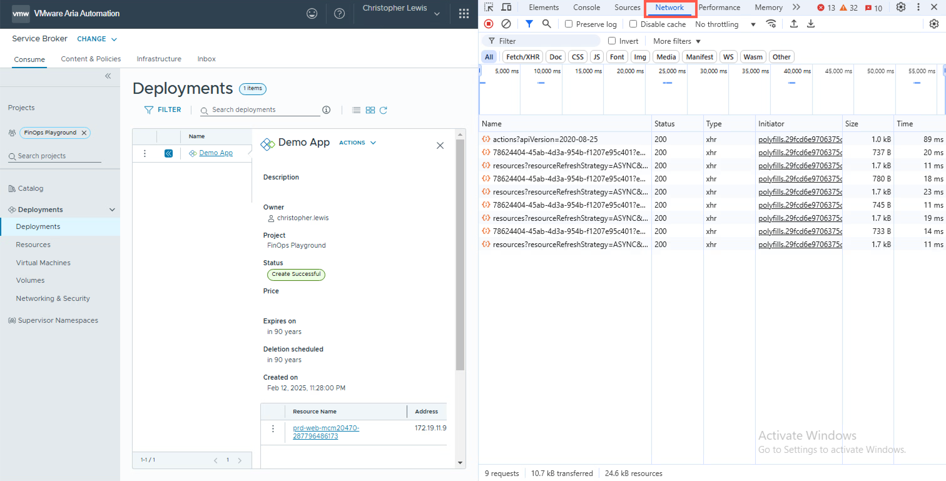 To identify the relevant REST API call, we are going to use a combination of the browser-based Developer tools to capture the actual call in realtime and the API Docs (which are located on the appliance at https://<auto.fqdn>/automation/api-docs)