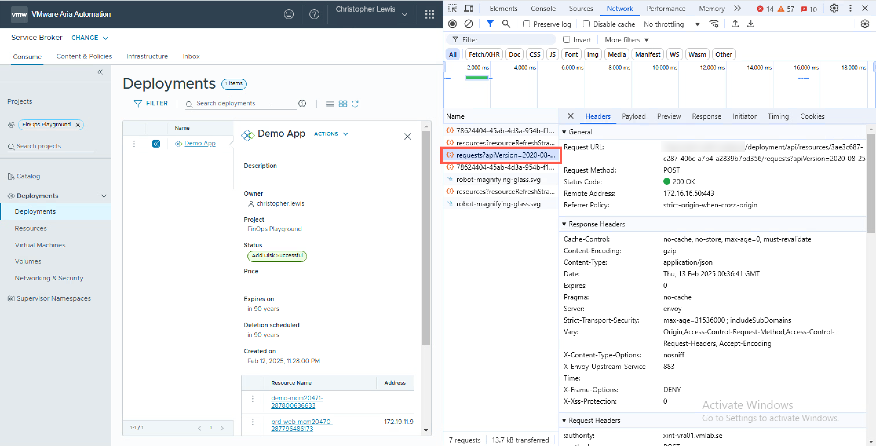 - The Request URL, which is https://vra.fqdn/deployment/api/resources/{resourceId}/requests?apiVersion=2020-08-25 .