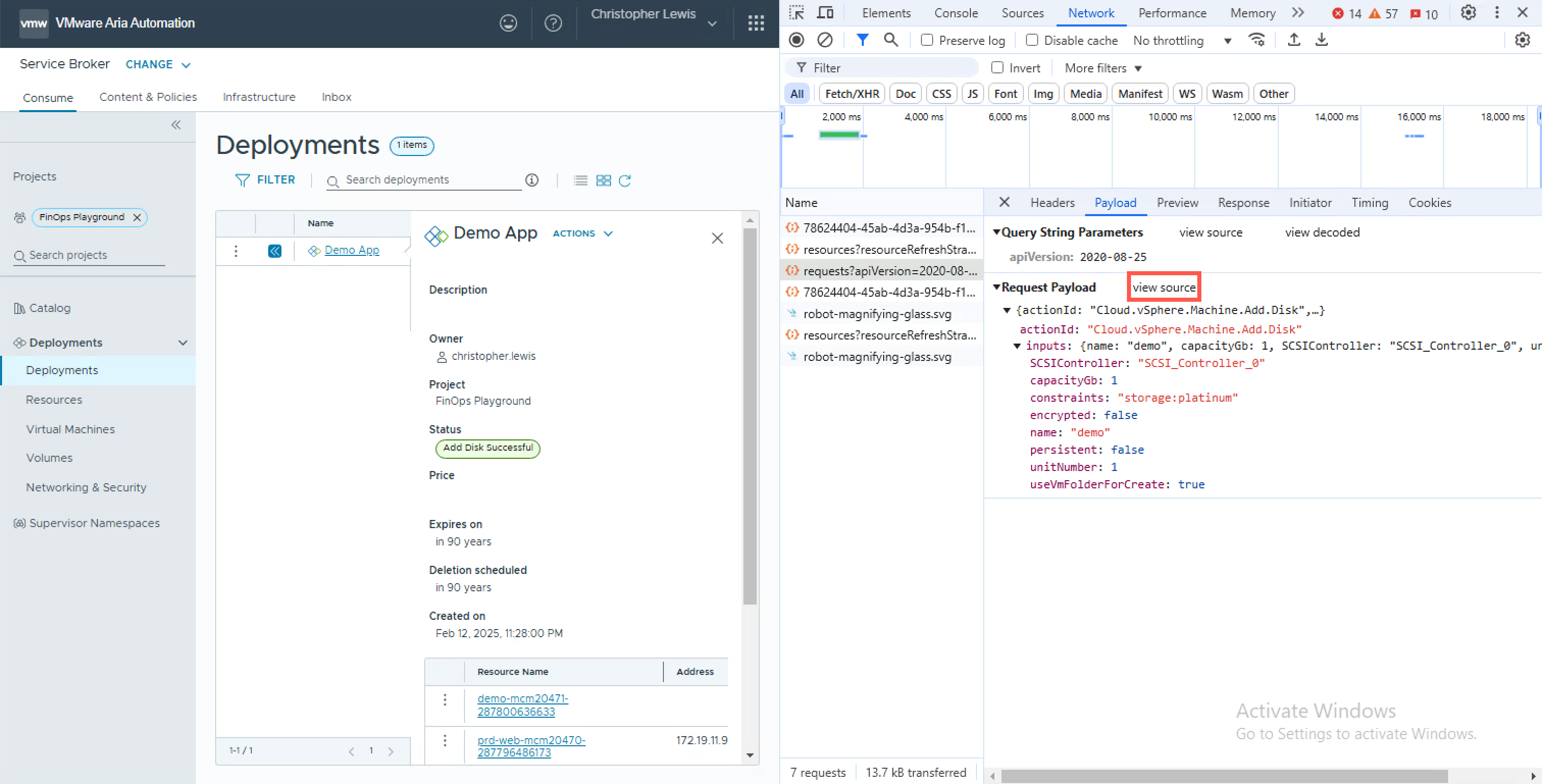 - At the Chrome Browser Developer Tools pane, locate and click on the API item shown as requests?apiVersion=2020-08-25.